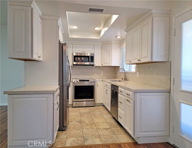This charming one-story residence offers easy, step-free living and a bright, open atmosphere. The enclosed patio is a perfect year-round retreat, featuring skylights and a ceiling fan for comfort and natural light. Inside, you’ll find wood-like laminate flooring throughout the main living areas and custom tile floors in the bathrooms. The modern, remodeled kitchen shines with stainless steel appliances, recessed lighting, and ample counter space. A second door opens to a common area, bringing in additional light and ventilation. The home offers central heating and air conditioning for complete climate control. The Jack-and-Jill bathroom includes a shared tub and small windows to promote natural airflow. Both bedrooms are spacious, filled with sunlight, and offer generous storage. Conveniently located within walking distance of the Performing Arts Center, this home also includes a nearby carport for easy access. Enjoy all the wonderful amenities and activities this vibrant Laguna Woods community has to offer!