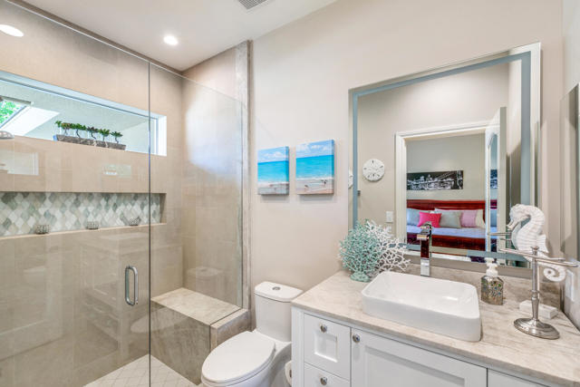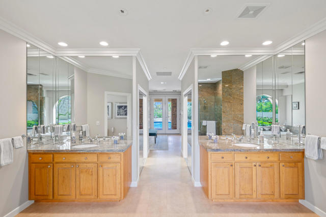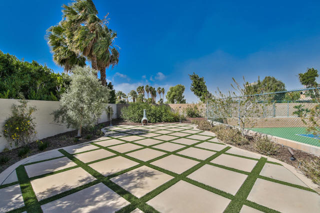 Experience resort-style living in this private, gated 1.14-acre Rancho Mirage estate featuring a complete 2-bedroom guest house, a large attached 2-bedroom casita, and breathtaking mountain views. Designed for entertaining and relaxation, the property offers a total of 7 bedrooms and 6 full baths, and 5 large garages, a lighted regulation tennis court that can convert to two pickleball courts, a sparkling Pebble Tec heated saltwater pool with tanning shelf and rock spillway, and a 50-amp full-hookup RV site with its own private gate, of any size and easy access. The main home showcases elegant porcelain tile floors, quartz countertops, and a chef's kitchen with an expansive island, illuminated cabinetry, Sub-Zero refrigerator, wine and 2 beverage coolers, and a 4-burner stove with griddle and grill. The guest house includes a full kitchen, living room, washer/dryer, bathroom, and two-car garage, while the attached casita features a large walk-in closet spacious enough for two queen beds. Additional highlights include a Vantage LED lighting system, owned dual-bank solar electric system, motorized roller shades, central vacuum, and drought-tolerant landscaping with premium artificial turf. With no HOA fees and efficient IID utilities, this fully walled and gated estate offers unparalleled privacy, sophistication, and comfort. Offered turnkey furnished with four king beds and four queen beds, this showpiece property is a must-see for those seeking the ultimate in Rancho Mirage luxury living.