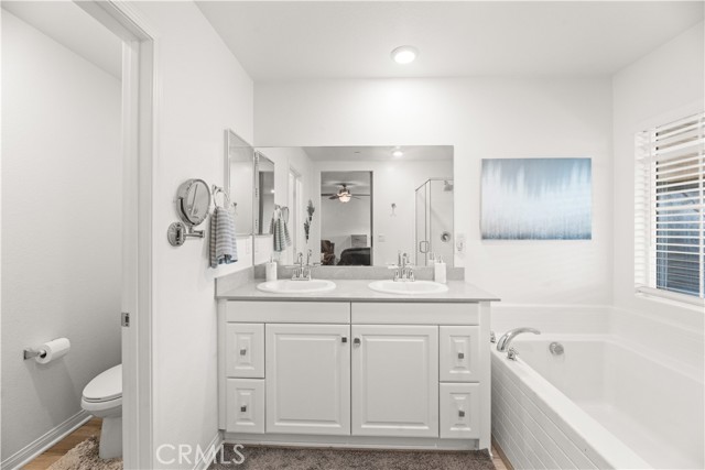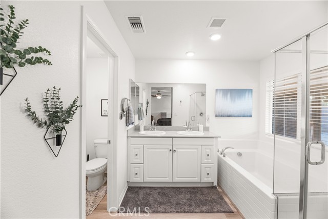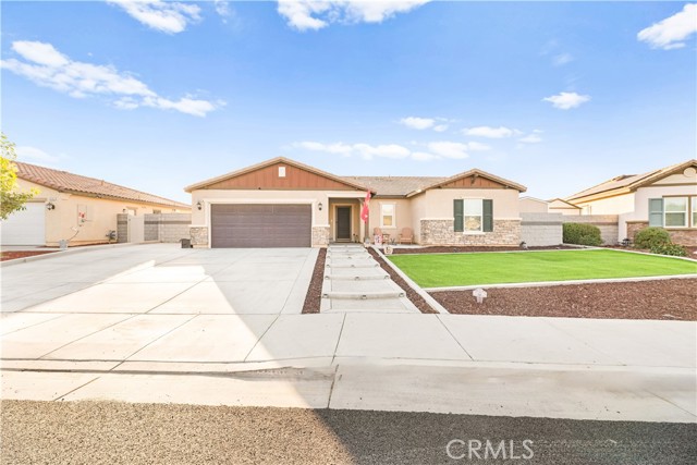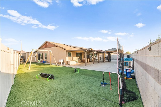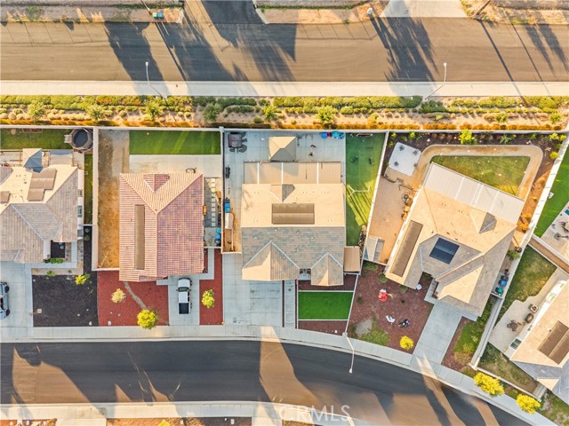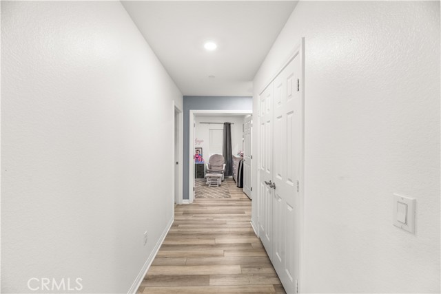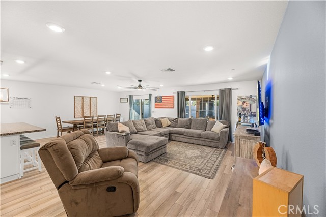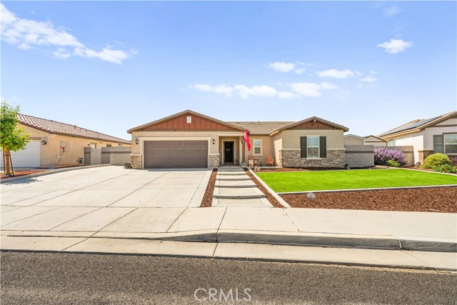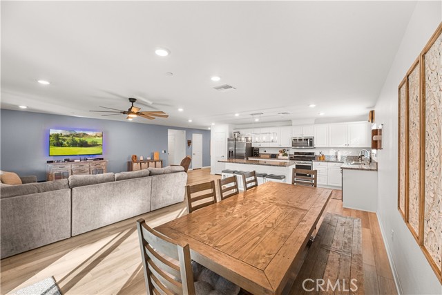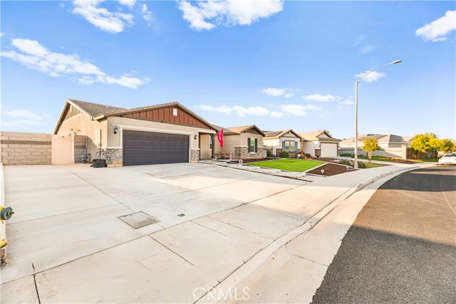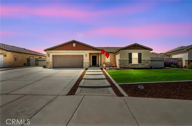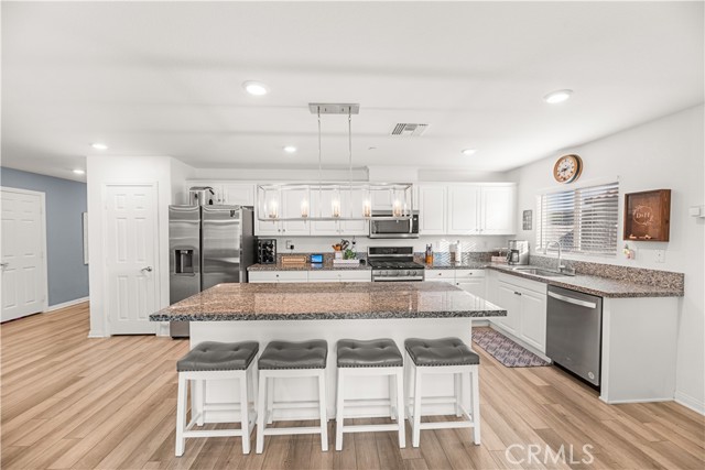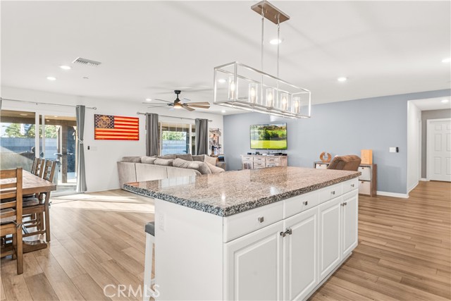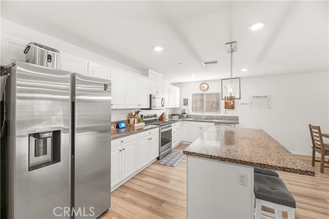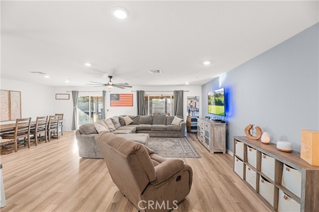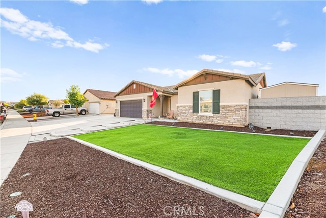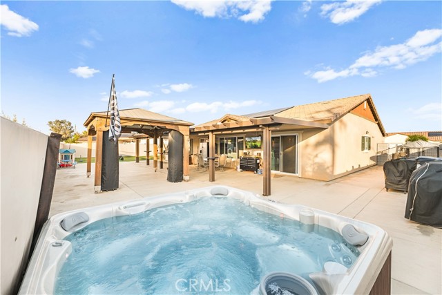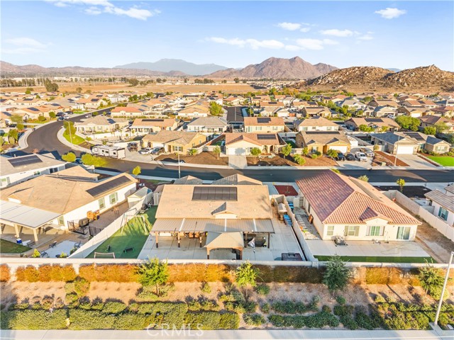 Welcome to this stunning single story solar powered home built in 2021, perfectly located in a quiet Menifee community surrounded by parks, walking trails, and quick freeway access. With modern curb appeal and an open-concept layout, this home offers the best of comfort and efficiency. Inside, enjoy a bright and spacious great room that flows seamlessly into a designer kitchen featuring white shaker cabinets, quartz countertops, stainless-steel appliances, and a large center island. The primary suite is a relaxing retreat with dual sinks, quartz vanity, walk-in shower, and generous closet space. Three additional bedrooms provide flexibility for family, guests, or a home office. Step outside to a low-maintenance backyard complete with artificial turf, a large covered patio, concrete entertaining area, and spa—perfect for gatherings or quiet evenings under the stars. VETERANS/ACTIVE DUTY MAY QUALIFY FOR ASSUMING 2.65% INTEREST RATE LOAN.