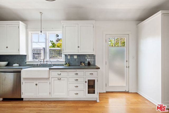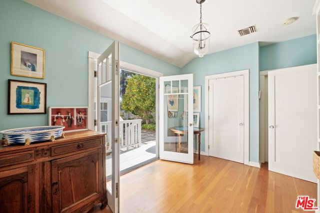 The Loom House, circa 1895. This California cottage, reimagined by the architect Ken Unger, has been meticulously rebuilt from the ground up, preserving the authenticity of its 19th-century origins while maximizing every charming inch of space. Nestled within a bucolic garden setting, with Washington Robusta palms keeping a humble eye over this home, invites a romantic lifestyle amid mature orange, lemon, clementine, plum, persimmon and Fuji Apple trees, an enchanting English garden, and Wisteria blossoms that in the spring are the pride of the neighborhood. The property includes an added detached two-car garage with a studio perched above, mirroring the home's classic clapboard siding. The studio (approx 400 sf), with its treehouse-like ambiance and a 1/4 bath plumbed for a shower, presents the perfect sanctuary for creativity or relaxation. The restoration boasts an inviting chef's kitchen with refined details such as Pennsylvania bluestone counters, a Shaw farmhouse sink, polished nickel hardware, Miele and Thermador appliances and solid premium grade white oak flooring, all contributing to its timeless appeal. The primary bathroom has Volakis marble floor, counter top and tub, and Perrin and Rowe Edwardian plumbing fittings throughout. Set on a generous 5,250 square foot lot, Zoned LAR2 this residence is also available to be purchased in tandem with the adjacent property (825 Coeur D'Alene), creating a 9,450 sf lot Venice compound like no other. Whether you're seeking a full-time sanctuary, an inspiring creative retreat, or a savvy investment, 2621 Grandview Avenue delivers it all with unmatched heart, soul, and exceptional versatility. Located in the premium Presidents Row neighborhood of Venice near Abbot Kinney and the beach this residence offers proximity to all the cultural and culinary delights of the area. Not to be missed!