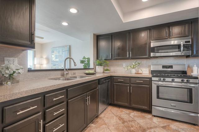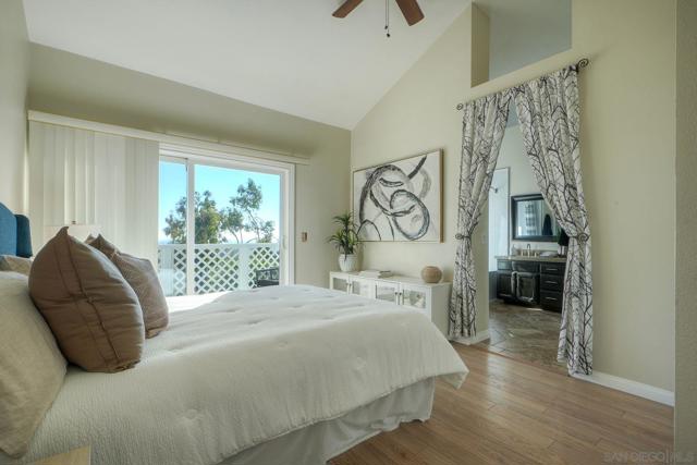 Charming lake view townhome in Nob Hill. Nicely upgraded with engineered wood floors, dual pane vinyl windows, stainless appliances, granite countertops, and recessed lighting. The patio and balcony off the primary bedroom each have beautiful and relaxing views of Lake Miramar. The home is tucked back in the far southeast end of the complex where it is very quiet and peaceful. Close access to 15 freeway, Trader Joes, local restaurants and more!