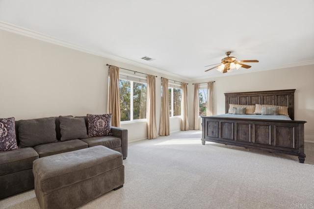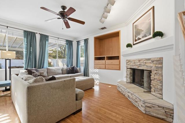 Welcome to Stratford Place in Shadowridge! Nestled in one of Vista’s most desirable neighborhoods, this beautifully maintained residence offers 3 bedrooms and 2.5 baths on a generous 6,981 sq ft lot, combining comfort, function, and timeless design. Perfectly situated on a double cul-de-sac street, the home enjoys privacy and a strong sense of community—ideal for morning walks, evening strolls, or friendly gatherings with neighbors. Inside, the open floor plan offers a warm and inviting atmosphere, featuring laminate flooring, crown molding, a cozy flagstone fireplace, and thoughtfully designed living spaces that flow seamlessly throughout the home. The spacious family room features a custom built-in entertainment center, while the kitchen and dining areas provide an effortless layout for both everyday living and entertaining. Upstairs, the expansive primary suite offers a peaceful retreat with generous dimensions and ample closet space. Notable upgrades include brand new carpet upstairs, energy-efficient dual-paned windows, central A/C, ceiling fans throughout, an upstairs laundry room with sink and extra storage, and custom cabinetry in the garage for maximum organization. The private, fenced-in backyard is beautifully landscaped with low-maintenance plants and a charming flagstone walkway—perfect for relaxing, gardening, or hosting friends. With low HOA fees, proximity to top-rated schools, scenic walking trails, and all the conveniences of Shadowridge living, this home truly embodies the best of North County lifestyle.