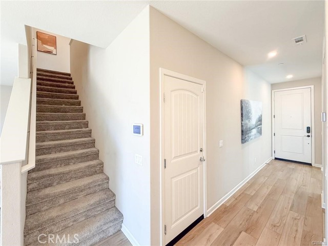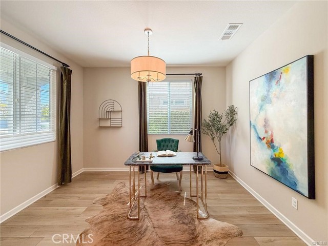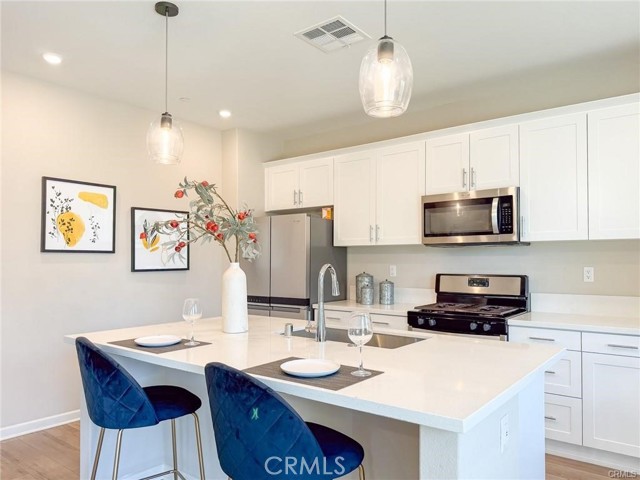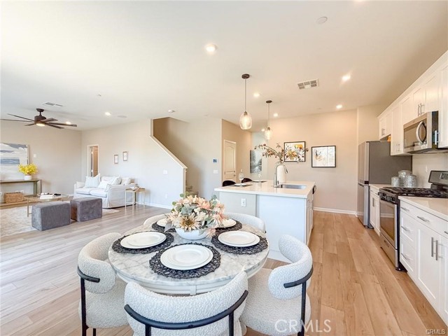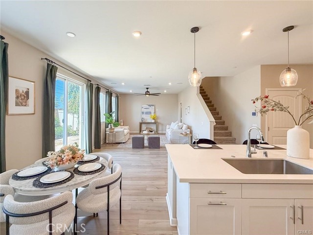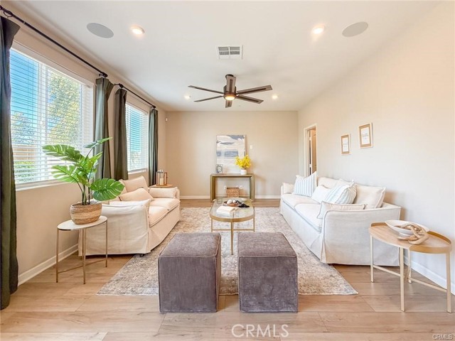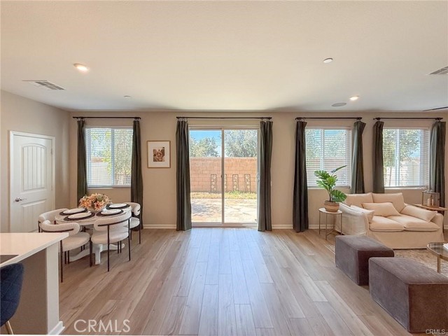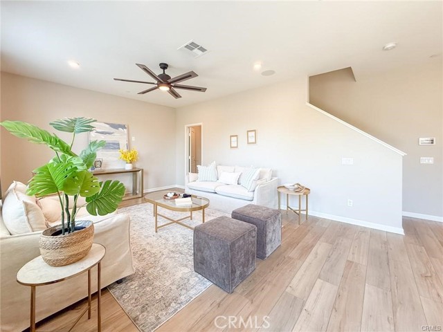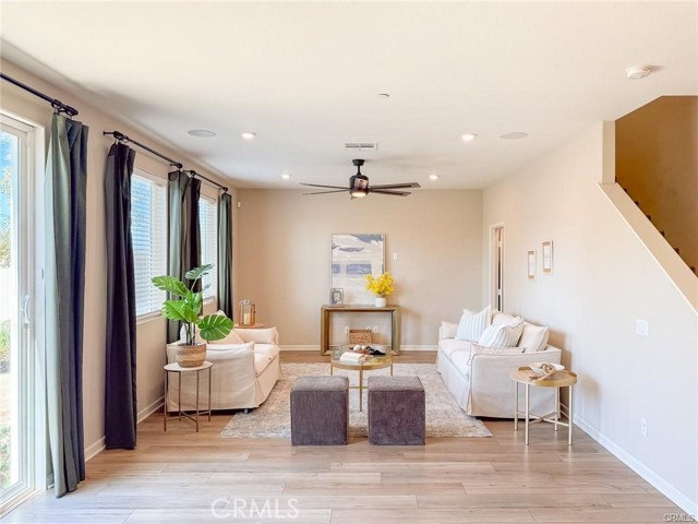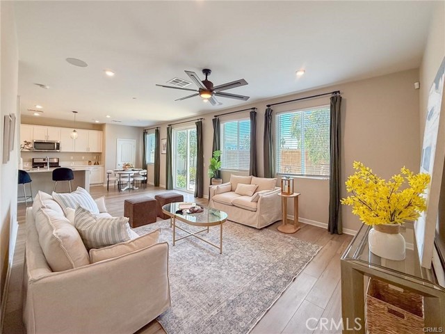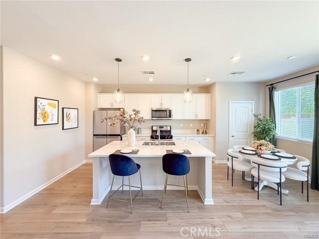 A beautifully maintained former model home located in a desirable gated community in Moreno Valley. Built in 2021, this newer single-family residence offers 4 bedrooms, 2.5 bathrooms, plus a downstairs office and an upstairs loft, providing flexible living space for today’s modern lifestyle. The home features builder-upgraded finishes throughout, including luxury vinyl plank flooring, quartz countertops, stainless steel appliances, and smart-home technology. As the original model, it has been meticulously cared for and remains in pristine condition. The open-concept kitchen with a large center island flows seamlessly into the dining and living areas, creating an inviting space for both everyday living and entertaining. Upstairs, the spacious loft serves perfectly as a secondary lounge, study area, or playroom. The large primary suite includes a walk-in closet and a dual-sink vanity. A fully landscaped backyard offers a private outdoor retreat, while the attached two-car garage provides added convenience. Located in a quiet gated community with amenities such as a pool, playground, and BBQ area, and just minutes from shopping, dining, schools, and major freeways—this home delivers the ideal blend of comfort, style, and accessibility.