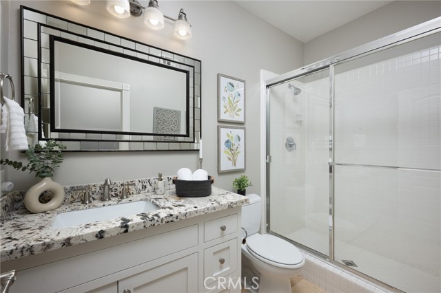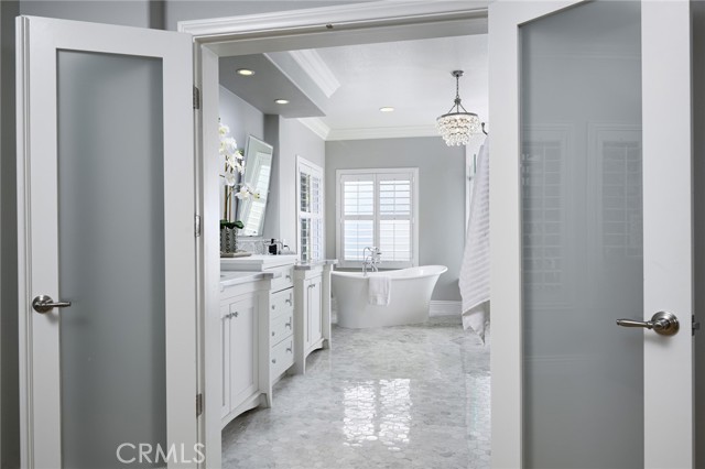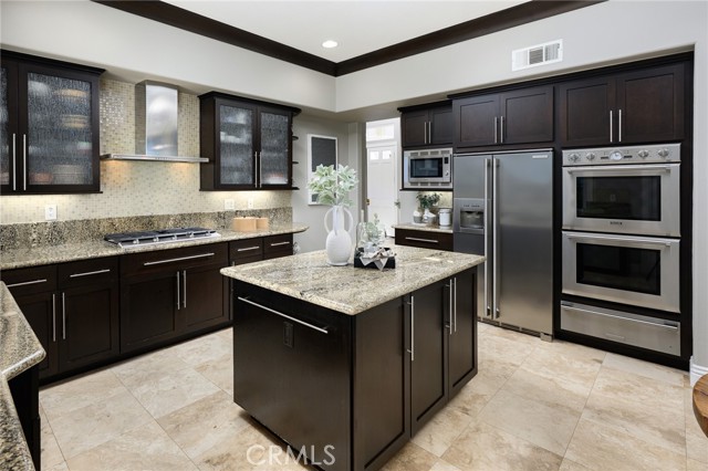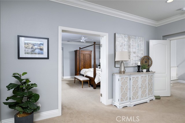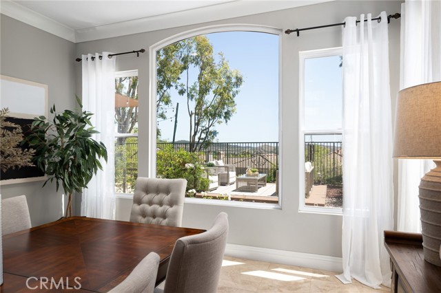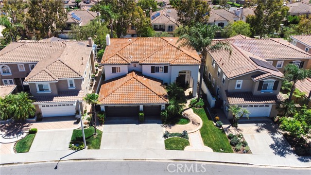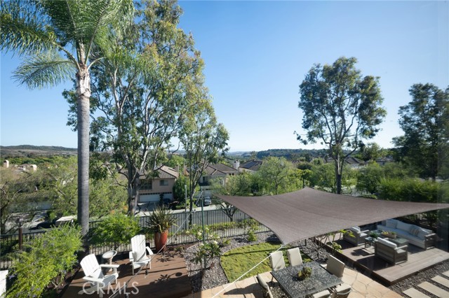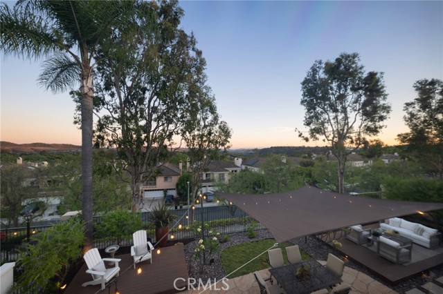 Built by the highly regarded JM Peters, this beautiful four bedroom, four bathroom home is located on a cul-de-sac street in the prestigious Paragon tract of Rancho Santa Margarita. With a view of the surrounding hills, the home offers a spacious and flexible floor plan, including a main-floor den or fourth bedroom. Inside, you’ll find elegant touches throughout, stone flooring, crown molding, plantation shutters, recessed lighting, and an abundance of natural light. The heart of the home is the gourmet kitchen, featuring granite countertops, espresso-colored cabinets with glass insets and under cabinet lighting, Thermador double ovens, a walk-in pantry, a center island, and stainless steel appliances. The kitchen opens to a welcoming family room complete with a custom entertainment center and a fireplace with stone surround, perfect for everyday living or entertaining. The main level also includes a formal dining room with large windows, which could be used as a living room, as well as a piano room that could serve as an additional dining area. Upstairs, the spacious primary suite offers a peaceful view of the hills and includes a separate retreat with a fireplace, ideal as a home office or reading nook. The spa-inspired primary bathroom is stunning, with dual vanities, white cabinetry, a chandelier, a freestanding soaking tub, a walk-in shower, and dual closets with elegant glass doors. Two additional upstairs bedrooms each feature their own tastefully remodeled en-suite bathrooms, offering privacy and comfort for family or guests. Additional highlights include a convenient downstairs laundry room with built-in cabinets, a sink, and side yard access; a three-car attached garage; a full PEX repipe for plumbing peace of mind; and a leased solar system for energy efficiency. The backyard is beautifully landscaped with custom hardscape, outdoor lighting, and serene hills view, an ideal space for relaxing or entertaining. Enjoy all that Rancho Santa Margarita has to offer, including access to the city’s incredible amenities: swimming pools, tennis courts, the Beach Club lagoon, the lake, scenic parks, community concerts, and more. This home is a perfect blend of comfort, quality, and lifestyle in one of South Orange County’s most sought-after neighborhoods.