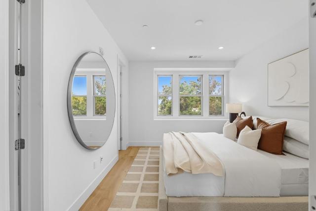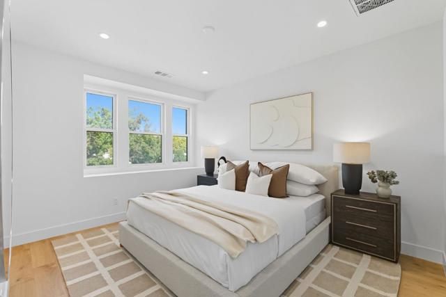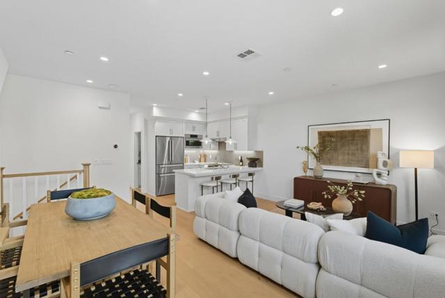 Built in 2022, this modern Mountain View townhome offers 3 bedrooms, 3 bathrooms, and 1,471 sq. ft. of thoughtfully designed living. Natural light fills the open-concept main level, where a sleek kitchen with quartz countertops, stainless steel appliances, and ample cabinet space flows seamlessly into the dining and living areas. Wide-plank engineered hardwood floors extend throughout the home, creating a sophisticated backdrop. The flexible floor plan includes a main floor bedroom with a full bath, ideal for guests or a private office. Upstairs, two bedrooms provide comfort and privacy, along with the convenience of indoor laundry. Designed for comfort and efficiency, the home features triple-pane windows, a north-facing orientation for added brightness and privacy with no direct neighbors on one side, and fully paid solar panels. Close to major tech campuses, top-rated schools, shopping, dining, and parks, this home captures the essence of Silicon Valley living.