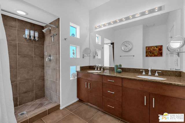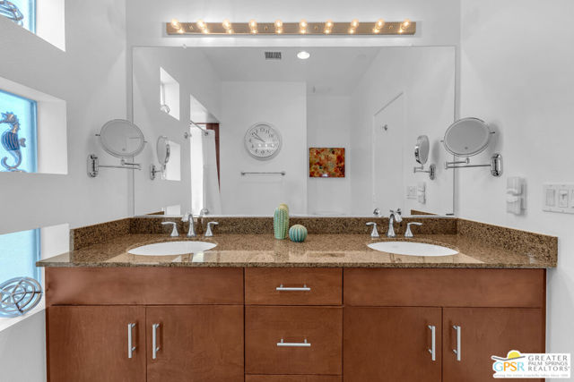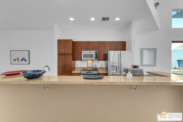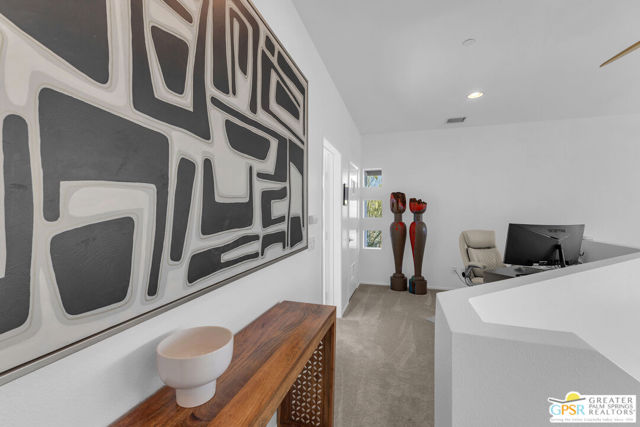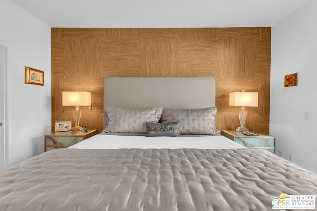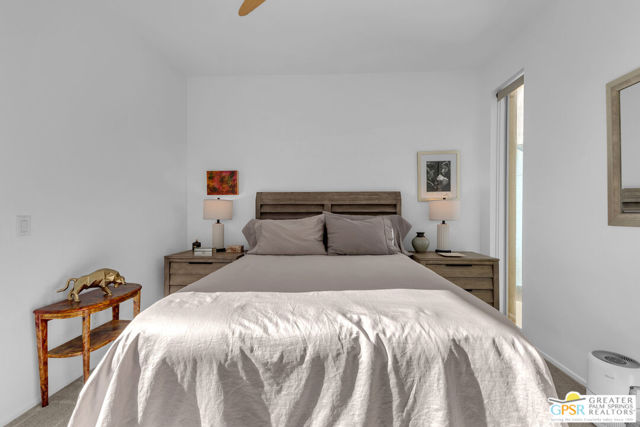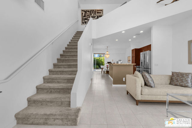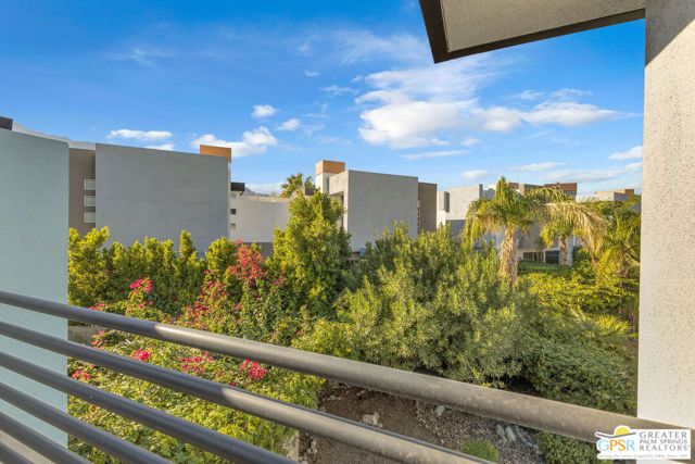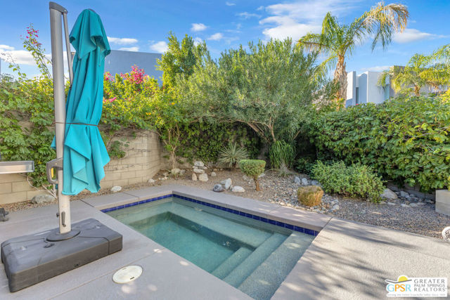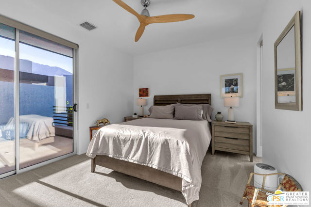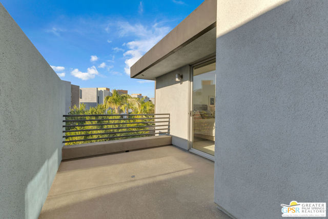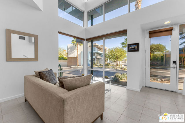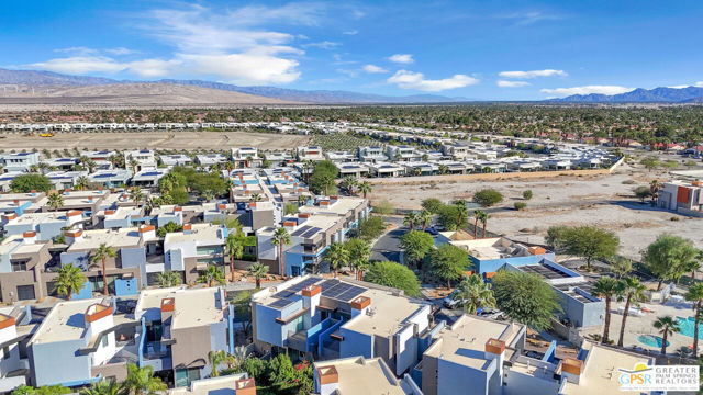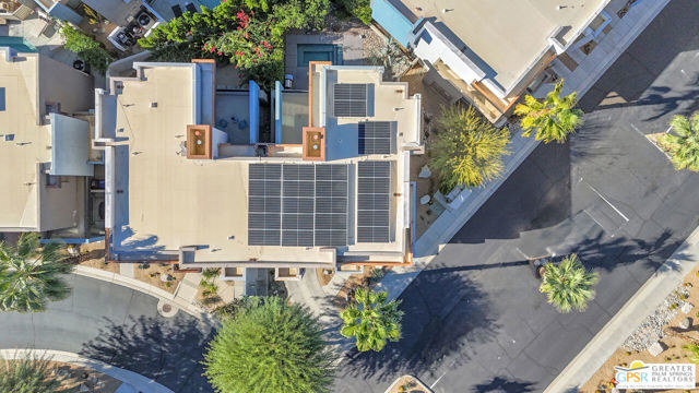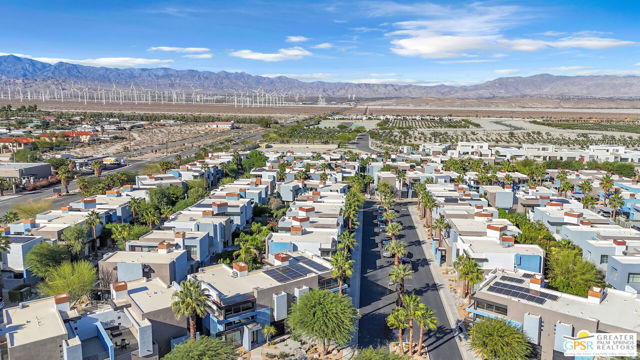 Located in Palermo, one of Palm Springs' most desirable gated communities, this rare Floor Plan A southeast-facing corner unit combines modern design with desert serenity. Featuring a 24-panel owned solar system, it delivers impressive energy savings and sustainability without sacrificing style. Dramatic two-story windows frame mountain views, complemented by new flooring, fresh paint, and a new HVAC system (April 2025). As you enter, soaring two-story windows draw in abundant natural light and showcase sweeping mountain views, creating a bright and airy atmosphere. The interior features new flooring and fresh paint inside and out, offering a clean, modern feel throughout. Upstairs, two generous en-suite bedrooms each open to a shared, oversized upper deck through sleek glass slidersan ideal spot to unwind and take in the sunset against the mountain backdrop. Outside, enjoy the privacy of your own space with plenty of mature vegetation, newly remodeled spool, covered built-in gas fireplace, and BBQ grill hookup. Upstairs, two en-suite bedrooms share a large deck; the primary offers a walk-in closet and dual-vanity bath. Other features include an EV-ready garage, personal driveway, and best of all it sits on FEE land -- so you own it outright! The HOA covers water, trash, maintenance, and resort-style amenities such as a fitness center, community pools and spas, and Billiards room. With direct access to Indian Canyon Drive, the home is just minutes from Uptown's Design District, plenty of dining, shopping, trails, and more. Reach out today to schedule a private showing!