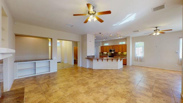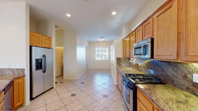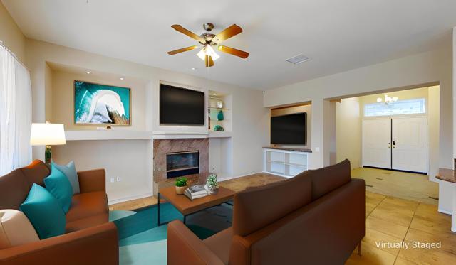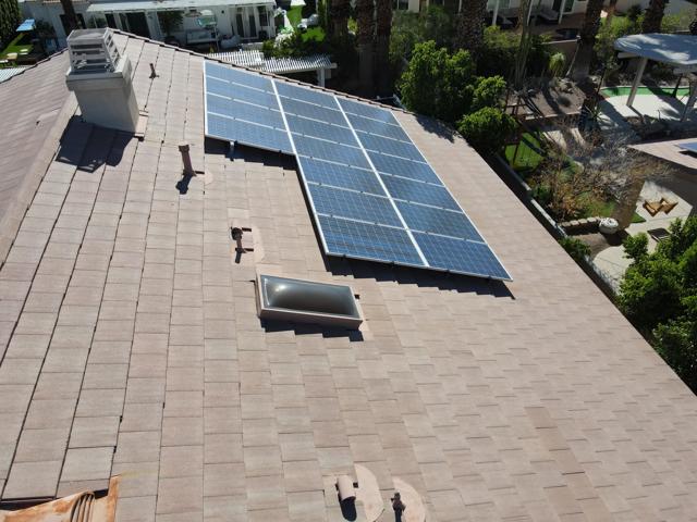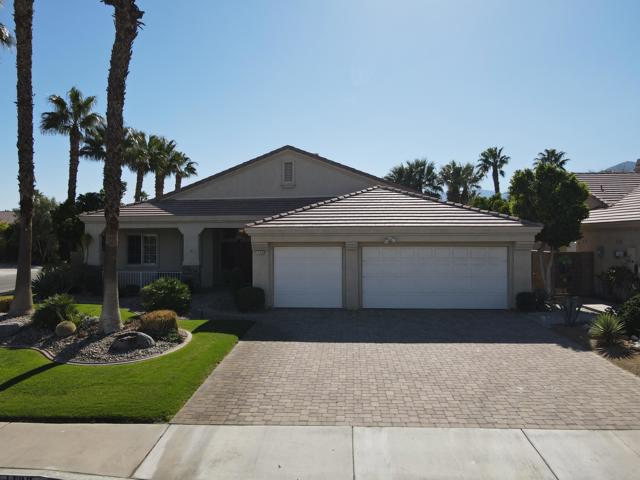 This Vintage Palms home captures the relaxed Palm Springs lifestyle with a perfect balance of comfort and function for year-round living. Featuring 4 bedrooms, 2.25 baths, and 2,343 sq ft of open living space, this move-in ready residence welcomes you with warm natural light and beautiful decorative tile flooring throughout. The spacious great room centers around a cozy fireplace and opens to a bright kitchen with granite counters, stainless appliances, a pantry, and an adjacent office nook ideal for work or study. The primary suite includes dual vanities, a safe step soaking tub, and a separate walk-in shower. Step outside to your private backyard retreat with a sparkling pool and spa powered by solar, a covered patio for shaded relaxation, and south-facing mountain views. Energy efficiency shines with owned solar (not leased), a Generac backup generator, whole house water softener, and two HVAC systems for year-round comfort. A 3-car garage with a custom paver driveway completes this offering. Situated on a large corner lot of 10,019 sq ft with no HOA, this home is close to schools, shopping, entertainment, and quick freeway access--ideal for a second home or full-time living in the heart of Palm Springs.