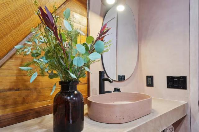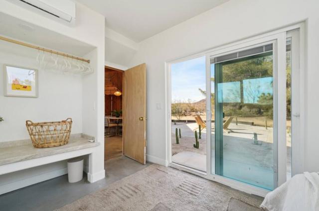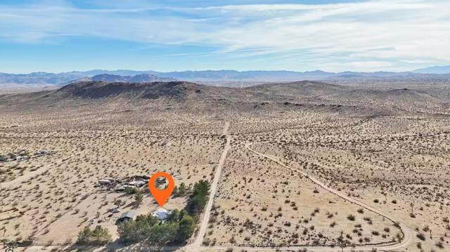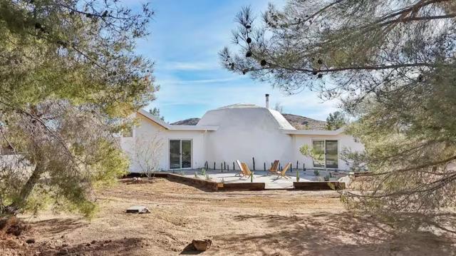 One-of-a-kind geodesic dome home that features designer touches enhancing the enchanting aesthetics. Built in 1975, this rare architectural gem features a spacious open floor plan with skylights, high ceilings, concrete floors, mini-split hvac, and a triple orb pendant lighting. Loft styled with curated Scandinavian botanicals and minimalist plant decor. Dining area is anchored with an oval chain swag light with ample room for many guests. Kitchen with breakfast bar, Taj Mahal quartzite counters, electric stove and cooktop, recessed lighting, tile backsplash, stainless steel dishwasher and refrigerator. Bathroom with vessel sink vanity, large walk-in shower with glass and raindrop shower-head. Two bedrooms with smooth white walls, dual alcove shelves and glass sliders leading to the patio. Fully fenced 2.5 acres with towering mature pinion pines enhancing the privacy and shade. Water well used primarily for agricultural purposes. Ample parking and a detached 700sf garage. Enjoy starry nights with friends under the milky way. Quad hammock star. Patio adorned with ''Mexican fencepost'' cactus, Arizona Star agave and mature Joshua Trees. Shaded front patio. Hot tub with electrical sub panel. Sunken bench lounge area. Next to thousands of acres of government open space with hills and trails to explore. Not far from the Joshua Tree National Monument where about 3 million tourists visit annually. 12 miles to Yucca Valley for all amenities. 44 miles to Palm Springs. 132 miles to Los Angeles. Don't Wait! - Call Now!