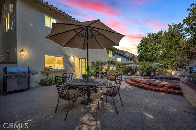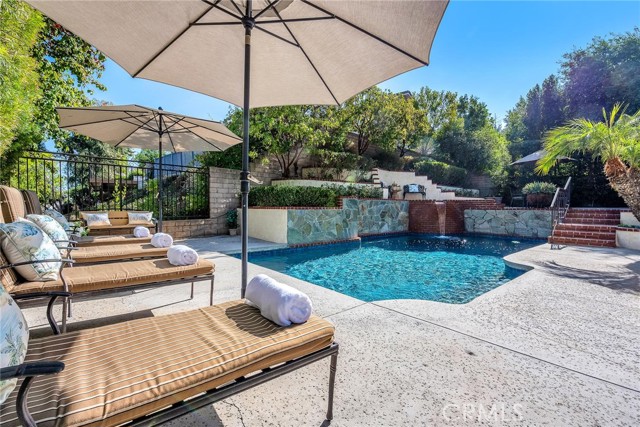 Truly spectacular West Hills pool home in the much sought after Castle Peak Estates and the Las Virgenes School District. Beautifully remodeled, this 4 bedroom, 3 bath sunlit home is the largest and most popular Castle Peak floor plan with almost 2900 sq ft of open living space. Enter this beautiful home through the custom glass front doors and step into the large foyer. You will be greeted with soaring ceilings, picture windows, custom fireplace that looks like a piece of artwork, travertine floors, recessed lighting and dual pane windows. The heart of the home is a spectacular grand kitchen featuring a 9 ft center island with prep sink, and separate dining space perfect for entertaining, granite counters, stainless appliances including a built in Dacor fridge, double oven, warming drawer, 5 burner-gas cooktop and pot filler. The kitchen seamlessly flows into the enormous family room with custom maple cabinetry, a second fireplace and powder room. Outdoors, enjoy resort-style living with pool, spa and 4 separate lounging and dining areas all surrounded by lush landscaping. Upstairs you will find the spacious primary retreat with custom built-in cabinets, large walk-in closet and primary bath with soaking tub. The three additional bedrooms and bathroom are all spacious in size. Additional highlights include a 3-car garage, light filled interiors, and premium finishes throughout with tons of storage. This home offers the ideal blend of modern comfort and entertainer's flair in an enviable school district.