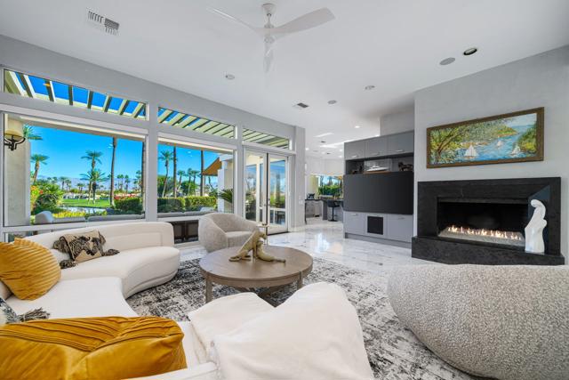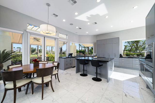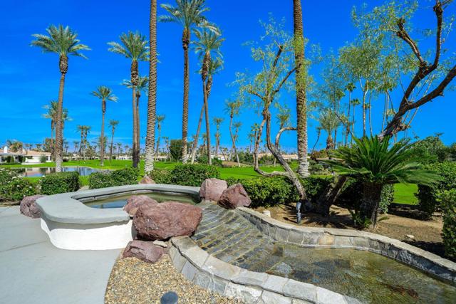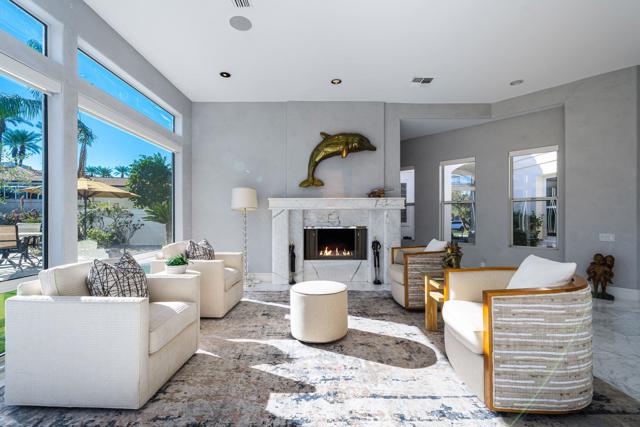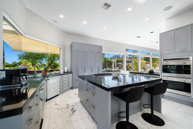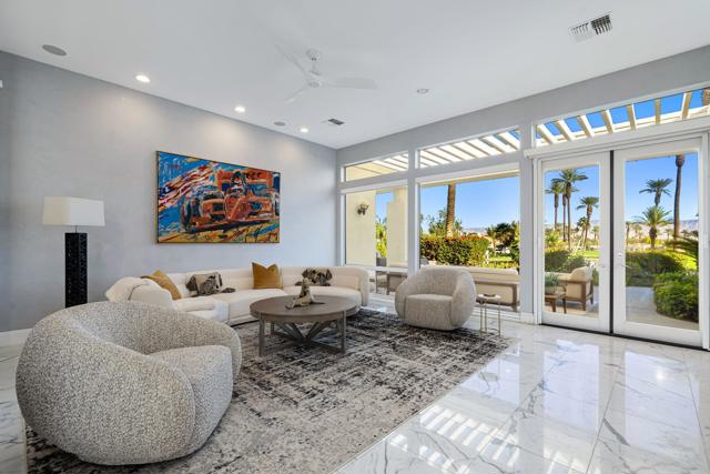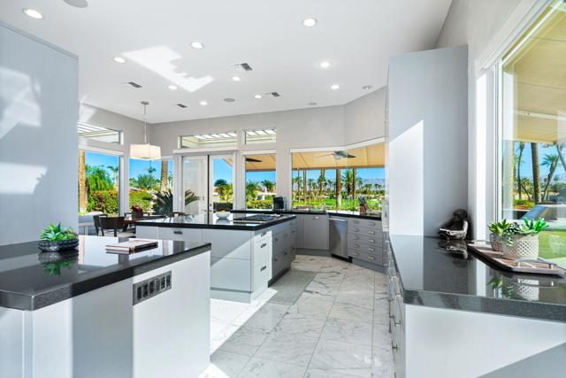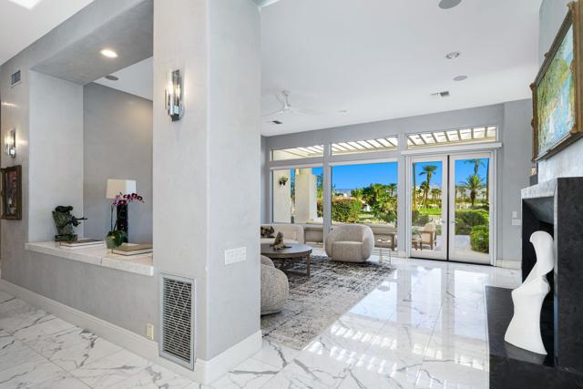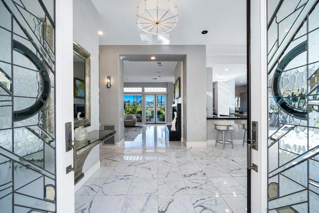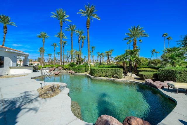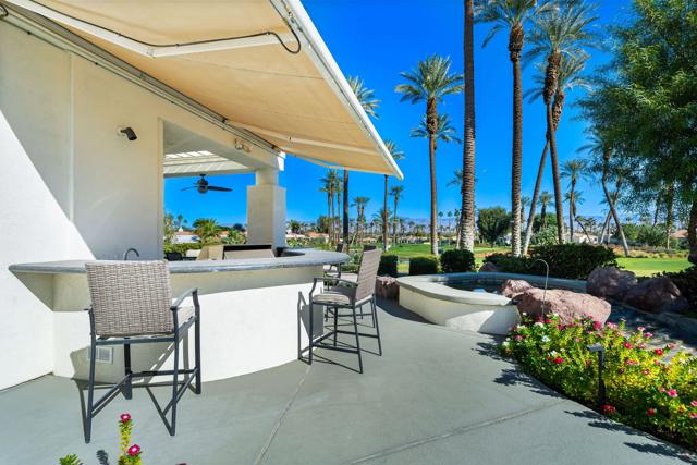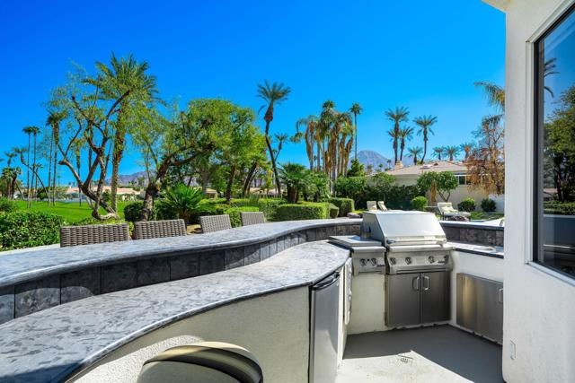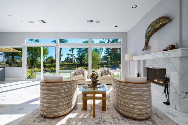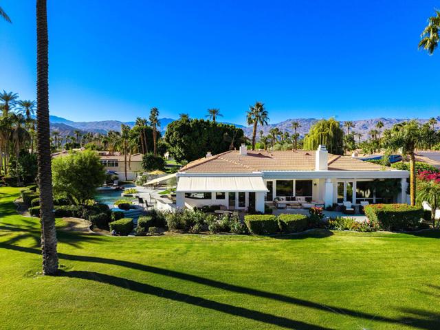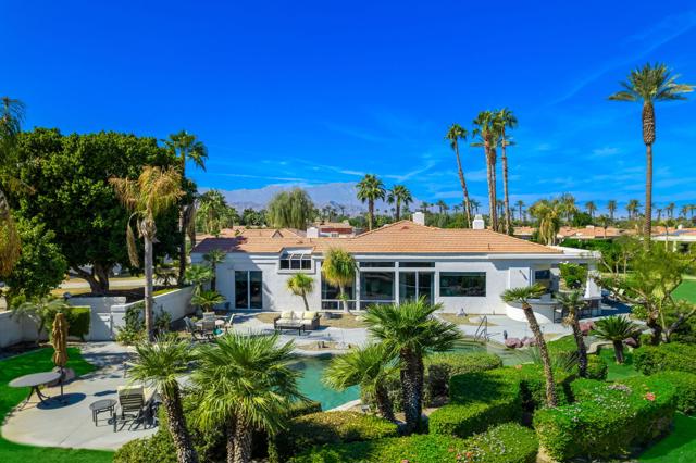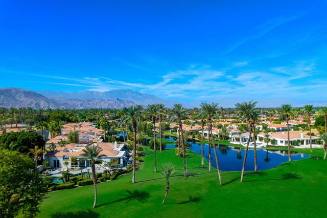 Truly a rare opportunity to own the crown jewel of Desert Horizons! This is desert living at its finest! Perched high above the landscape on one of the largest lots in Desert Horizons, this exceptional home captures the best panoramic views in the community stretching across the lush green fairways to the dramatic mountain backdrop beyond. Dramatically detailed this residence blends sophisticated style with warmth and comfort. Every space showcases the views, custom-quality finishes, creative uses of tile, granite, and stone, and an inviting calming palette. The unique floor plan flows from the great room into the kitchen and living room. With impressive soaring ceilings, gleaming tile floors, skylights and expansive floor to ceiling windows that bring the outdoors in. Two fireplaces anchor the family room and the living room, while the third fireplace is in the expansive main bedroom. The large gourmet kitchen complete with stainless steel appliances and rich wood cabinetry will delight even the most discerning chef. The private primary suite offers a peaceful retreat with a walk-in closet, spa-inspired bath, and captivating views through large sliders and windows and a cozy fireplace.This home has 4 bedrooms all with on-suite and updated.Step outside to an entertainer's dream patios featuring a sparkling pool and spa, outdoor bbq area, beautiful landscaping with so much space. All perfectly positioned to take in the sweeping golf course and mountain vistas. The dramatic landscape lighting completes the ambiance for cool, romantic desert nights.The Premier View Lot in Desert Horizons Country Club!