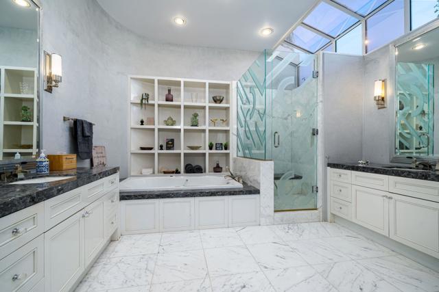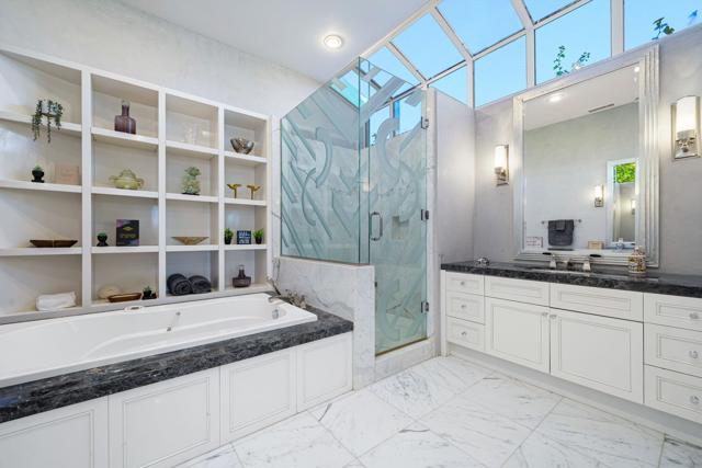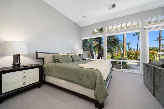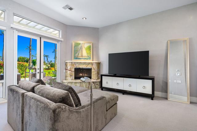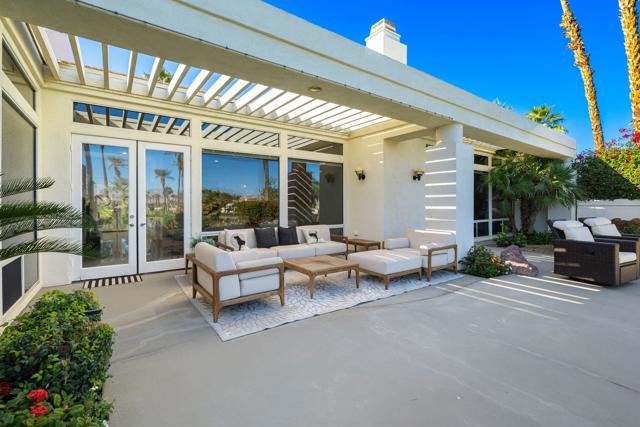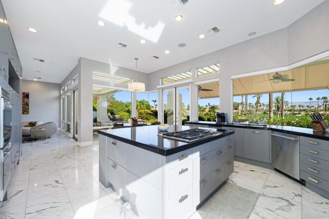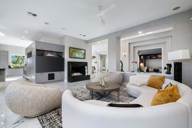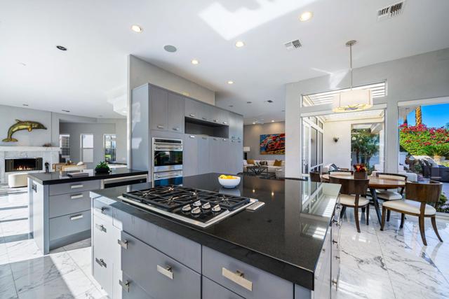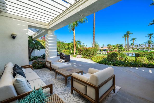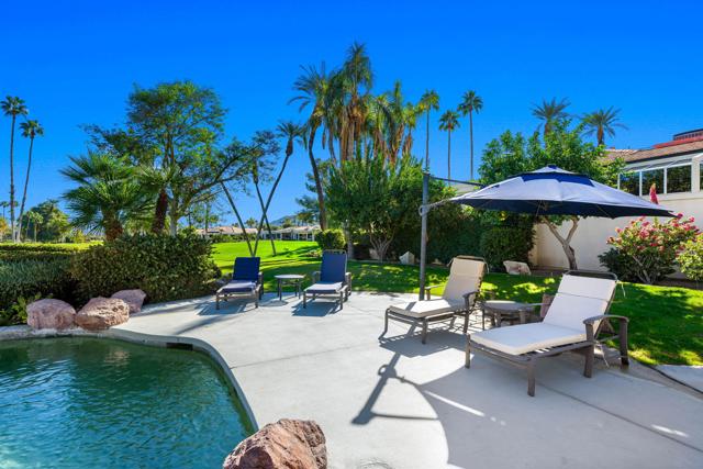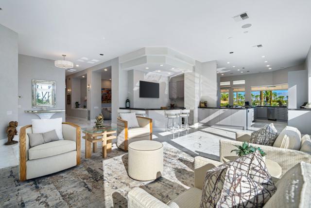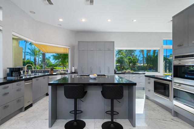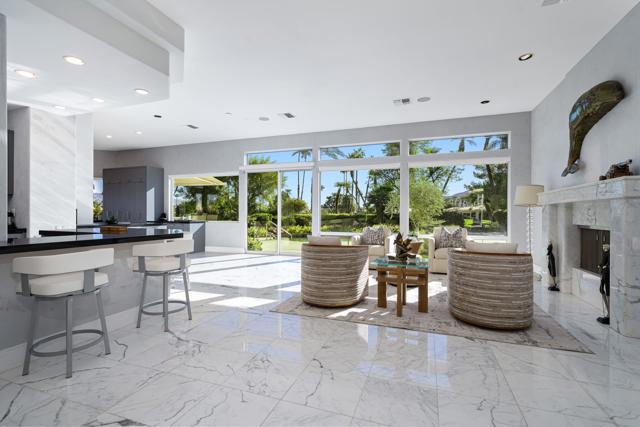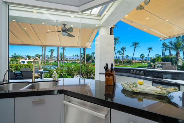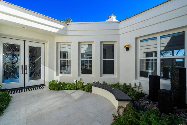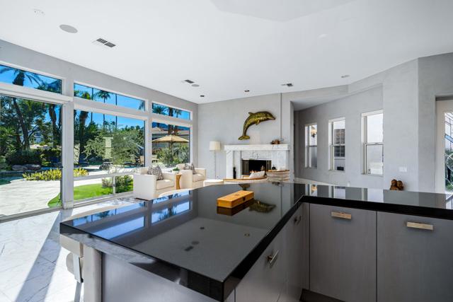 Truly a rare opportunity to own the crown jewel of Desert Horizons! This is desert living at its finest! Perched high above the landscape on one of the largest lots in Desert Horizons, this exceptional home captures the best panoramic views in the community stretching across the lush green fairways to the dramatic mountain backdrop beyond. Dramatically detailed this residence blends sophisticated style with warmth and comfort. Every space showcases the views, custom-quality finishes, creative uses of tile, granite, and stone, and an inviting calming palette. The unique floor plan flows from the great room into the kitchen and living room. With impressive soaring ceilings, gleaming tile floors, skylights and expansive floor to ceiling windows that bring the outdoors in. Two fireplaces anchor the family room and the living room, while the third fireplace is in the expansive main bedroom. The large gourmet kitchen complete with stainless steel appliances and rich wood cabinetry will delight even the most discerning chef. The private primary suite offers a peaceful retreat with a walk-in closet, spa-inspired bath, and captivating views through large sliders and windows and a cozy fireplace.This home has 4 bedrooms all with on-suite and updated.Step outside to an entertainer's dream patios featuring a sparkling pool and spa, outdoor bbq area, beautiful landscaping with so much space. All perfectly positioned to take in the sweeping golf course and mountain vistas. The dramatic landscape lighting completes the ambiance for cool, romantic desert nights.The Premier View Lot in Desert Horizons Country Club!
