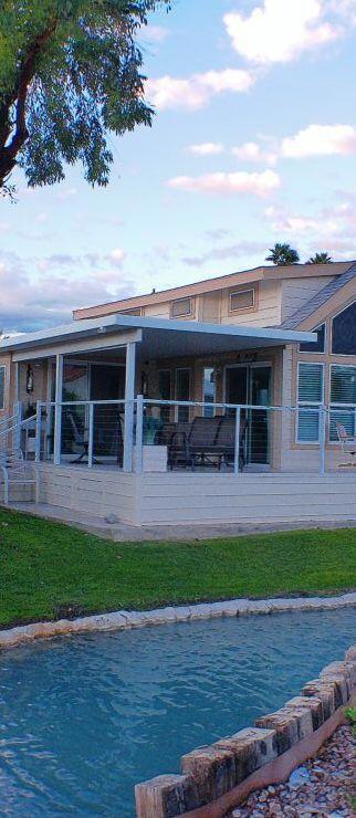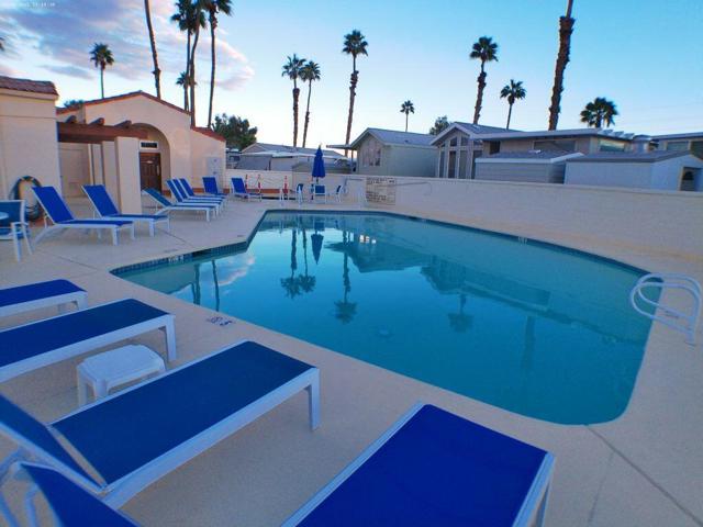 Cavco Park Model with a Loft overlooking Sat ''A'' with water everywhere in the back. You overlook the pool/spa area with Mtns in the Background. Covered Deck with BBQ area below. The loft is extra area for a bed for guests or family, or you can use for extra storage. The owners added a small CA Room for guests to sleep or watch TV. This room is off the patio in the back. Great bedroom with Queen bed and lots of cupboard space. Bathroom offers a nice shower. Enjoy sitting on the Back Patio overlooking the pond and Sat ''A'' pool with outstanding sunsets. Hurray don't miss the opportunity to own this unit.