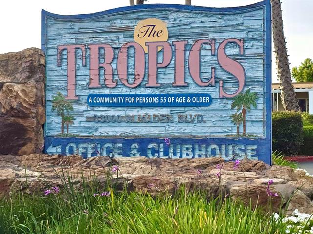 Presenting a mobilehome at The Tropics. This 2bedroom, 2bathroom, 2tandem parking spaces sit on a corner lot next to 3additional parking spaces for your guest visiting. Surrounded by a garden of flowers and fruit trees for privacy. The primary bedroom suite has walk-in-closet and stall shower bathroom. Laminate flooring throughout the home. A built-in hutch to keep your formal dishes in the dining area. A laundry room with washer and dryer included. Complete kitchen appliances - dishwasher, refrigerator, stove/oven range, etc. Outdoor shed for extra storage. Put your final finishing touches and call it home sweet home in this Senior Community of one 55+ and 35+ for co-occupants. Close to public transportation, major freeway, parks, shopping, entertainment and dining.