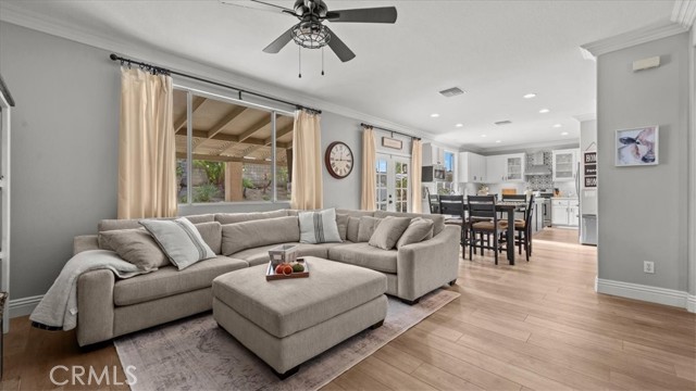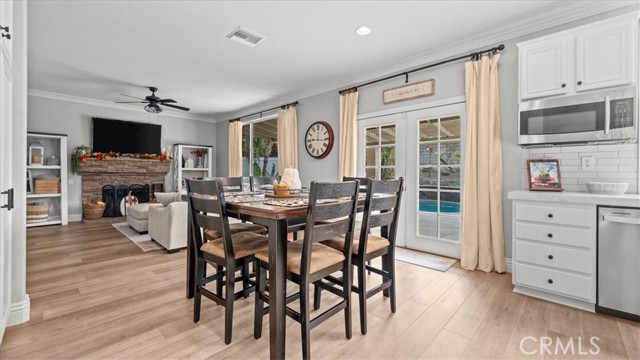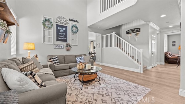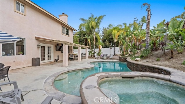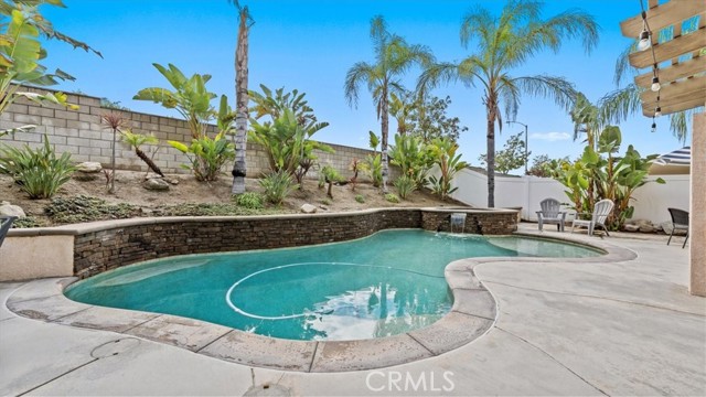 Is there a 4-bed home in Riverside with a pool, 3-car garage, and no HOA? In the heart of Orangecrest, this thoughtfully upgraded residence offers over 2,600 square feet of elegant living on a quiet, tree-lined street in the 92508 zip. A custom pebble-tech pool, designer kitchen, and flexible layout create a polished blend of sophistication and everyday comfort. Step inside to find wide-plank luxury vinyl flooring and detailed crown moulding throughout. The spacious kitchen features white shaker cabinets, quartz countertops, a charcoal-toned island, and a striking tile accent wall behind the gas range and stainless chimney hood. A large stainless farmhouse sink sits below a picture window with views of the private backyard. Enjoy a modern layout with open flow between kitchen, dining, family, and living rooms. The main level includes a full bedroom (used as an office) and bath, ideal for guests or multi-generational living. Upstairs, you'll find three more bedrooms including a generous primary suite with dual sinks, his and hers walk-in closets, soaking jacuzzi tub and separate shower. Out back, escape to a resort-style oasis: a custom in-ground pebble-tech pool with raised spa, stacked-stone spillway, and mature tropical landscaping including palms and birds of paradise. The backyard also offers an extended concrete patio, full vinyl fencing, retaining wall, and irrigation system for low-maintenance enjoyment. Additional updates include a new upgraded HVAC system, water heater, and a stacked-stone fireplace that anchors the main living area. A 3-car attached garage, no HOA, and proximity to top-rated schools and parks make this home a standout.
