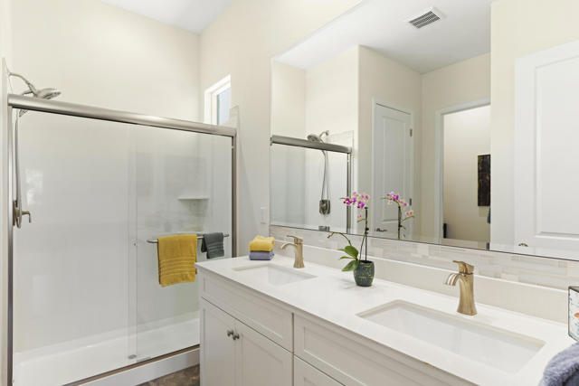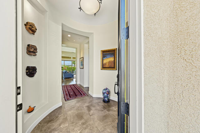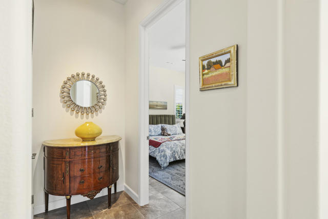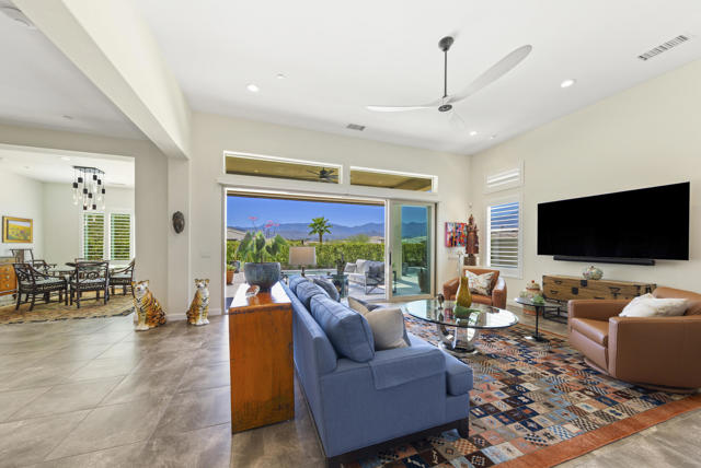BEST VIEW AT DEL WEBB! Welcome to this stunning SERENITY model with OWNED SOLAR and situated on an elevated corner lot to capture panoramic MOUNTAIN VIEWS. Featuring high ceilings and walls of glass, the home exudes luxury the minute you step into the rotunda foyer from the courtyard. The open floor plan centers on a sleek kitchen with KitchenAid appliances, granite countertops and an expansive island that flows into the living area with a MULTI PANEL SLIDING DOOR SYSTEM opening to a resort style backyard for true indoor/outdoor living. Enjoy the sparkling PebbleTec pool and spa plus side patio with pergola for BBQ and al fresco dining. Two private ensuites are well separated for privacy and the luxurious primary suite with spa like bath and custom walk-in closet opens to the pool and fabulous mountain views. The office/den with french doors and custom built-ins can also be used for a third sleeping space. Conveniences include a wine fridge, laundry room with sink and the garage features a built-in workshop, lots of storage, a water softener, tankless water heater plus its own A/C unit and insulated garage walls/ceiling. With all the finest finishes and details, this home has been meticulously maintained and is ready for you to enjoy. Del Webb Rancho Mirage is the premier 55+ community with walking trails, incredible views and so convenient to upscale shopping and dining. Residents enjoy a low HOA fee that includes cable and internet, Clubhouse, pools, tennis courts, pickelball, putting green, fitness center and endless activities. Call today to schedule your private showing.