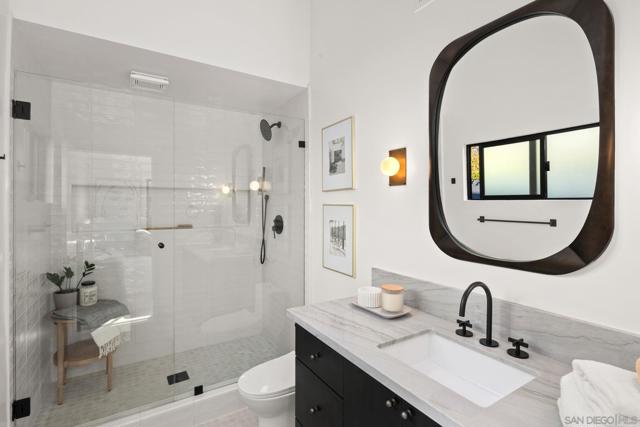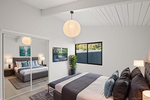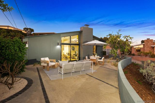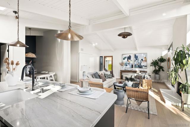 Nestled on a tranquil cul-de-sac in Pacifica—one of Pacific Beach’s most sought-after hillside neighborhoods—this architecturally significant, single-story William Krisel residence has been masterfully reimagined with a refined, modern sensibility. A dramatic living room welcomes you with soaring vaulted wood-plank ceilings, expansive new vinyl windows, and a striking fireplace that anchors the bright, open layout. New engineered hardwood flooring flows effortlessly throughout, guiding you to the front patio where panoramic bay and city vistas unfold—offering front-row enjoyment of evening SeaWorld fireworks and the sparkling skyline. The designer-curated kitchen impresses with vaulted beam ceilings, extensive custom cabinetry, premium stainless-steel appliances, quartzite countertops, a statement island, and artisan tilework, creating a culinary haven ideal for both casual gatherings and elevated entertaining. The tranquil primary retreat echoes the home's architectural style with lofty beamed ceilings and generous volume, complemented by an elegantly remodeled ensuite showcasing custom cabinetry, quartzite finishes, and a walk-in designer shower. Two additional bedrooms and a tastefully updated guest bath provide comfort and functionality for family or guests. Designed for effortless indoor-outdoor living, the newly landscaped grounds feature fresh plantings, lush ground cover, and sunny southern exposure in the backyard—offering a perfect canvas for a future terraced garden or outdoor sanctuary. Thoughtful improvements include a new asphalt-shingle roof layer, 200-amp electrical panel, upgraded ducting and thermostat, newer A/C, energy-efficient dual-pane windows and sliders, an added fourth bedroom/office and dining area, and a spacious two-car garage with abundant storage. Perfectly situated near Kate Sessions Park & Playground, Capehart Dog Park, top local schools, sought-after dining, convenient freeway access, and the vibrant coastal lifestyle that defines Pacific Beach, this exceptional turnkey residence blends iconic mid-century architecture with contemporary luxury and modern livability in one of San Diego’s most desirable neighborhoods.