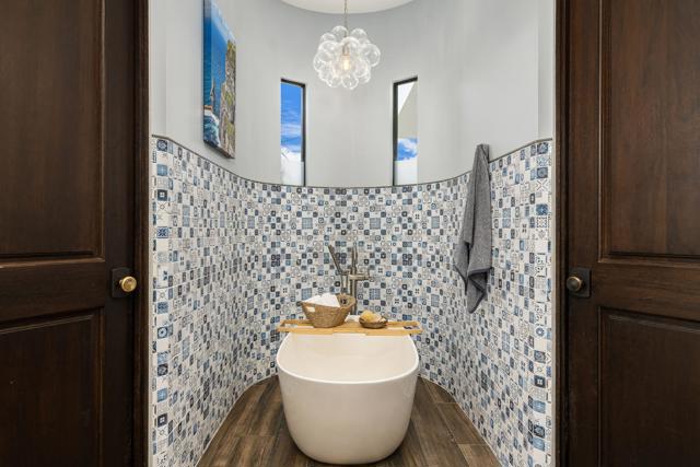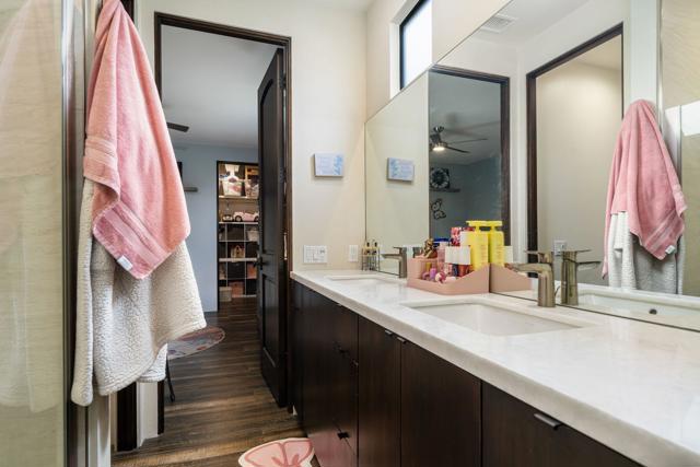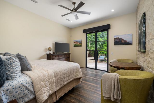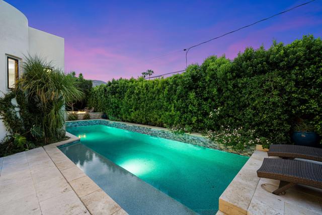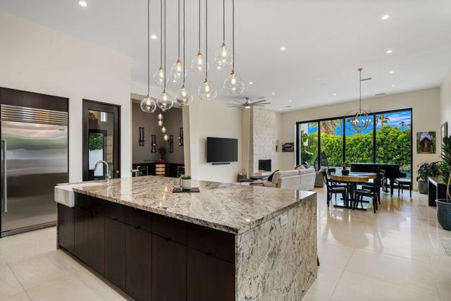 Completely rebuilt in 2020, this custom home blends modern design with organic finishes and meticulous craftsmanship. From the moment you step through the mahogany front door into the light-filled foyer, soaring ceilings, natural limestone accents, and solid 8' mahogany doors set the tone for a true desert retreat.The open-concept living space features a wine bar, stone fireplace, and oversized pocket doors that disappear to seamlessly connect indoors and outdoors. Multiple conversation areas extend to a private patio, sparkling pool with natural stone decking, outdoor shower, floating BBQ, and lush garden filled with fruit trees, grapes, olives, and herbs.The gourmet kitchen is a chef's dream, with a Sub-Zero refrigerator and freezer, six-burner Thermador range with griddle and pot filler, double ovens, dual sinks and dishwashers, expansive walk-in pantry, and a striking 5x10 granite waterfall island with seating and storage.The primary suite offers artisan iron-and-glass French doors to a private courtyard with fire feature, spa-like bath with freestanding tub, open shower, dual vanities, and two private toilets plus a custom walk-in closet. A second en suite bedroom, two guest rooms with Jack & Jill bath, a powder room, laundry, and mudroom complete the interior.Additional highlights include:XL 3-car garage (24x30) with 10' ceilings, 8' clearance doors, EV pre-wireFoam roof for added insulationNew underground plumbing, electrical, gas, and water with 200-amp serviceZoned HVAC (3 systems)Custom paver driveway and courtyardsBuilt-in angled concrete patio benchMultiple natural limestone walls and pillarsLocated at the end of a quiet street, this oversized lot offers mountain views and complete privacy, all within walking distance to El Paseo, dining, shopping, tennis, farmers market, and hiking trails.