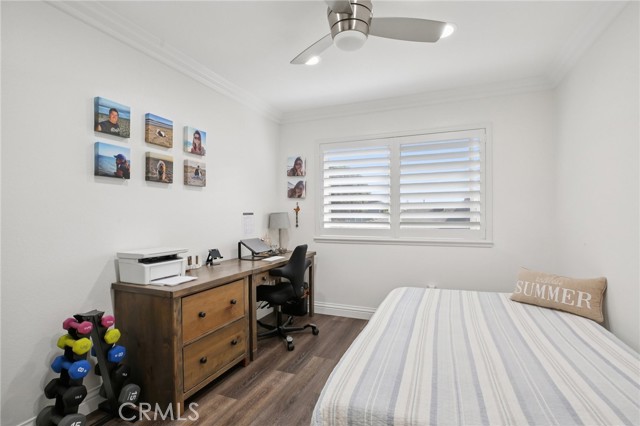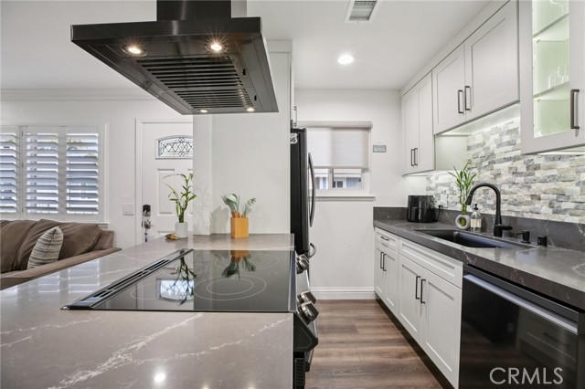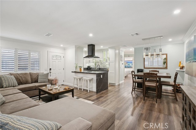 Welcome to Harbor Heights Villas, a beautifully maintained coastal community just minutes from Sunset Beach, Bolsa Chica Wetlands, and the scenic trails and waterways of Huntington Harbour. This upgraded 2-bedroom, 1-bath upper-level end unit offers modern style and comfortable living in one of Huntington Beach’s most desirable neighborhoods. The home features wide-plank flooring, plantation shutters, recessed lighting, and an open-concept layout filled with natural light. The remodeled kitchen includes updated cabinetry, sleek stone countertops, a designer tile backsplash, and a breakfast bar that flows seamlessly into the living and dining areas. The bathroom has been thoughtfully renovated with contemporary finishes, tile detail, and a glass-enclosed shower. Both bedrooms are spacious with ample closet storage and ceiling fans. Additional highlights include a private balcony entrance area, access to the community’s serene greenbelts, and a shared garage with one dedicated parking space plus additional community parking. Conveniently located near shopping, dining, everyday amenities, and some of the area’s best outdoor recreation. A fantastic opportunity to own a turnkey home in a highly sought-after Huntington Beach enclave.