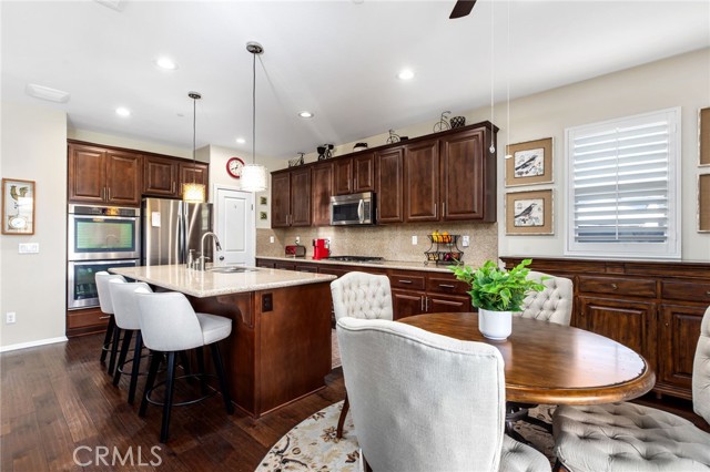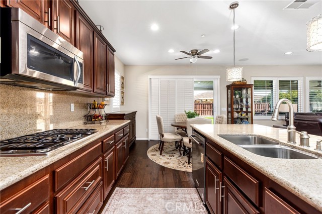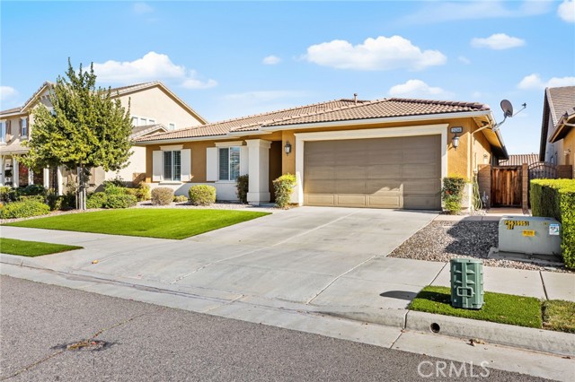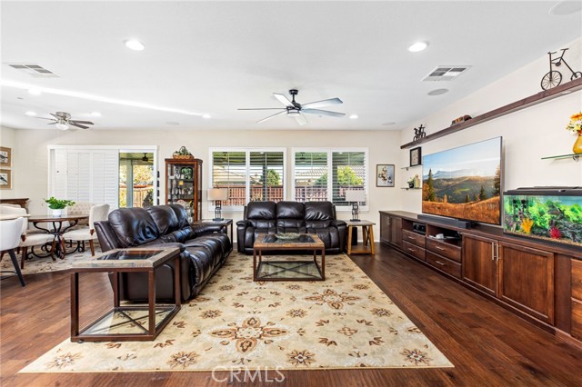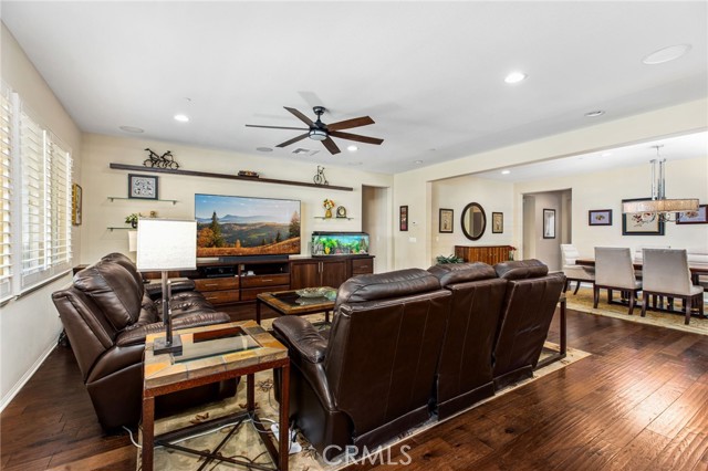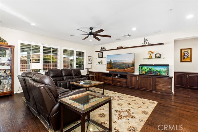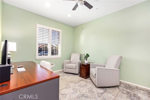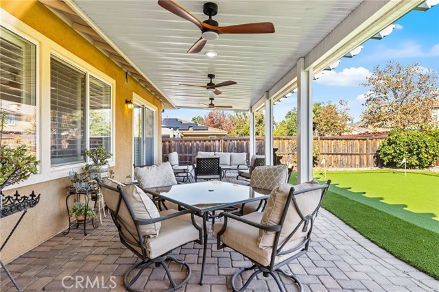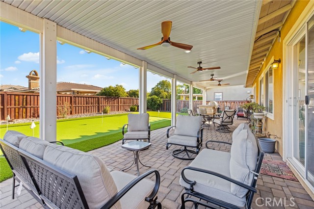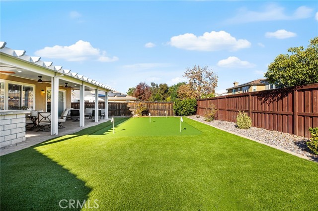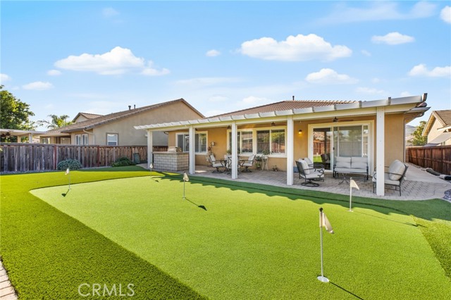 Welcome to a remarkable single-story cul-de-sac residence in the sought-after community of Heritage Lake, where thoughtful design, generous spaces, and elevated finishes come together with exceptional harmony. This well-crafted home offers three bedrooms, two-and-a-half baths, and an additional flex room currently used as an office that can easily function as a fourth bedroom, making the layout adaptable for a variety of lifestyles. Upon entering, you’re greeted by soaring 9+ foot volume ceilings and luxury vinyl plank engineered wood flooring that extends throughout the entire home, creating a seamless and refined foundation. The heart of the home is the expansive kitchen, designed for both everyday comfort and memorable gatherings. It features a large entertainer’s island, granite countertops, double ovens, stainless steel appliances, pendant lighting, extended built-in shelving and cabinetry, and a spacious pantry, all contributing to a beautifully functional culinary space. Flowing effortlessly from the kitchen, the family room continues the open-concept layout and is enhanced by window shutters and ceiling fans in every room for year-round comfort. The formal dining area provides an elegant space for hosting and includes a slider that opens directly to the backyard, promoting a natural transition between indoor and outdoor living. The primary suite offers a peaceful retreat with a separate soaking tub and walk-in shower, dual vanity sinks, ample storage, tile flooring, and a generous walk-in closet, all thoughtfully designed for comfort and privacy. Every room throughout the home benefits from abundant storage solutions, including the impressively functional laundry room, which offers upper and lower cabinets along with dual counter spaces. Additional storage cabinets in the garage complement the home’s whole-house water softener and purification system. The outdoor living is equally exceptional with orange trees for enhanced landscaping. The backyard features an extended covered patio with ceiling fans, a built-in barbecue, and a full putting green for the golf enthusiast, creating a low-maintenance space ideal for relaxation and entertaining. The front yard also features turf, contributing to remarkable curb appeal and easy upkeep. This standout home within Heritage Lake, features stunning outdoor amenities including two community pools, clubhouse, parks, walking trails, and a beautiful lake. A truly rare opportunity you won’t want to miss.