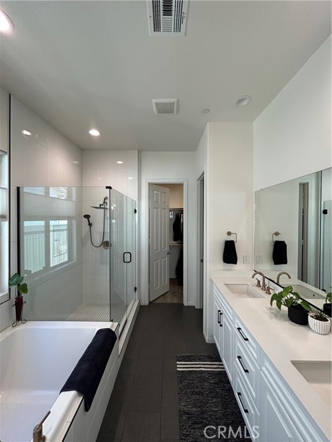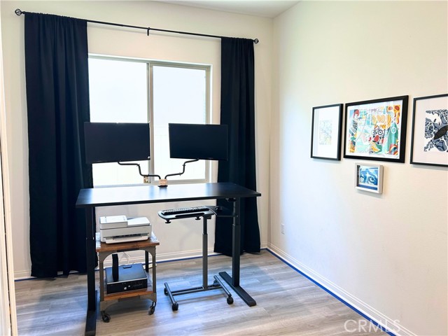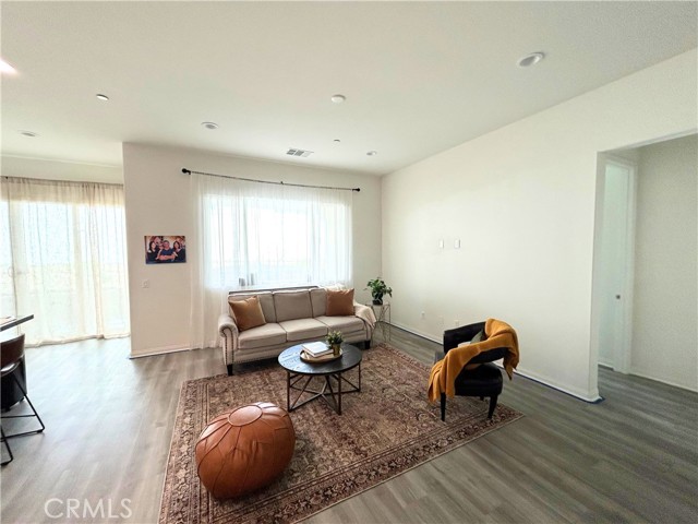 Beautifully upgraded single-story home featuring 4 bedrooms, 3 bathrooms, and a private office, offering exceptional flexibility of use. Built in 2020 with first occupancy in 2021, this thoughtfully designed home showcases an open-concept layout with 10-foot ceilings, recessed lighting, and luxury vinyl plank flooring throughout. Bedrooms, great room, and patio are pre-wired for ceiling fans. The spacious kitchen features granite countertops, soft-close cabinetry and drawers, premium appliances, dual GE ovens with SmartHQ app control, a large island with breakfast seating, and abundant storage. Bathrooms offer matching stone counters, soft-close cabinetry, and floor-to-ceiling tile in shower and tub surrounds for a clean, modern finish. Ethernet wiring throughout provides fast, reliable wired internet—ideal for remote work, streaming, and smart-home needs. Additional highlights include a generous laundry room with utility sink, tankless water heater, leased solar system, whole-house water filtration with reverse osmosis, and smart-home features for garage and exterior lighting. The finished garage features upgraded epoxy flooring and a 220-volt outlet. Enjoy a low-maintenance backyard with concrete patio and vinyl fencing. Located in the desirable Harvest community across from a park with mountain views and resort-style amenities including pool, spa, fitness center, clubhouse, parks, sports fields, community garden, and dog park. Convenient to schools, shopping, and dining, with approximately a 20-minute drive to the beach. Unassuming from the front, this home opens to a light, bright, and spacious interior that truly impresses.