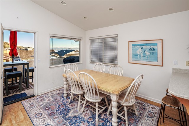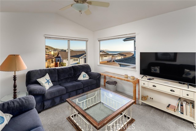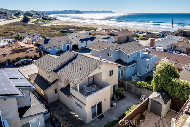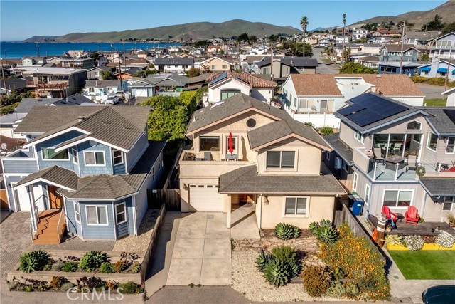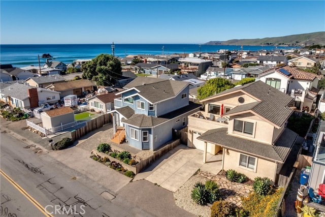 Located near the beach on desirable numbered streets, this ocean-view property offers an articulated silhouette with multiple decks, a sheltered entry, and an ample driveway providing extra parking. The property currently holds a vacation rental license, making it ideal for both personal enjoyment and income potential. A finely crafted entry door opens to a welcoming foyer with access to the garage and lower-level living areas. The garage includes washer and dryer hook-ups. The lower level features three bedrooms and two full bathrooms. One bedroom enjoys a street-facing window with a peek of the ocean, while another includes a sliding door to the rear yard. The upper level boasts vaulted ceilings, expansive glass areas, ocean views, and a convenient half bath. The well-appointed kitchen offers ample storage, quality countertops, and distinctive ceiling details. The living area includes a fireplace and additional ocean-view windows. A rear patio provides north-facing views and a peek of the ocean. An easy-care yard and nearby beach access at 24th Street complete this coastal offering.
