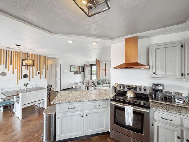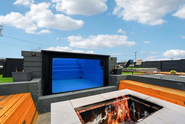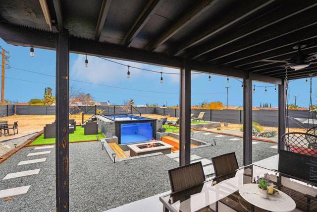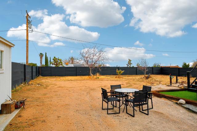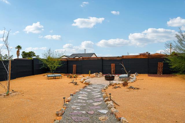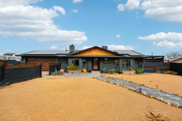 Gorgeous 2 bed, 2 bath featuring great curb appeal, leased Solar Panels, and many updates throughout! Enter into the living room with wood panel feature wall and electric fireplace with raised hearth. The living room opens to the dining area with custom wooden wall design and the remodeled kitchen featuring granite countertops with included refrigerator, light grey cabinetry, and a breakfast bar seating area. The laundry room sits just off of the kitchen with included washer and dryer, and the room also accesses the garage. Both of the bedrooms are generously sized with the primary bedroom offering a private bathroom with dual sink vanity and walk-in shower and there is a slider to the side yard with covered pergola, hot tub and pavers. There is also a 2nd bathroom for guests and the secondary bedroom to share, also featuring a walk-in shower. Enjoy the private backyard with container pool, firepit, covered patio, and beautiful joshua trees! There are also 2 accessory buildings and plenty of flat useable space that is ready to be made your own! Sitting off of a paved road, and currently an Active Vacation Rental, do not miss your opportunity to own this fantastic home!