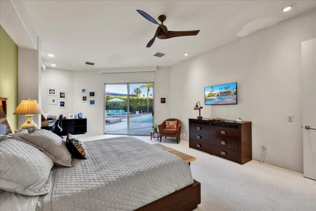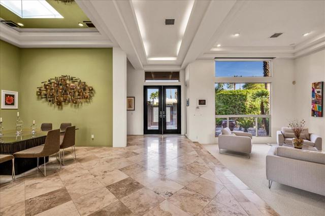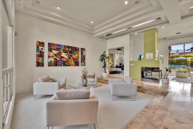 An exceptional find in the heart of Rancho Mirage--discover Sterling Cove gated community, an enclave of custom-built homes in desirable Tamarisk neighborhood. Designed with a unique blend of modern contemporary elegance and desert luxury. Property is infused with natural light. High ceilings accentuate the airy open feel--resulting in a floorplan that works as well for group entertaining as intimate get togethers. Private, gated courtyard entry enhanced by lush, yet low-maintenance landscape and majestic palm trees for optimal curb appeal. As you enter, walls of glass complete the ambiance and frame picturesque West mountain views. Multiple slider access gives an instant indoor/outdoor feeling. Ceiling soars over large great room & formal dining area. Focal point dual-sided fireplace serves as custom contemporary room divider linking great room & living room. Spacious, gourmet eat-in kitchen boasts luxe appliances. Custom cabinetry, granite counters, tile backsplash--tons of storage and prep space. Primary suite with adjacent sitting area/office, luxurious spa-like light-filled bath. Custom closet built-ins. Outdoors beckons...nearly one third of an acre lot showcases a resort-style oasis. Sleek pool with waterfall features and spa. Generous covered patio with custom shades. Hardscape enhanced with turf, mature hedges, citrus & palms give a tropical lush feel. Countless upgrades enhance the living experience. Travertine tile flooring, custom window coverings, drop-down shades, upgraded fixtures throughout. 3-Car garage, whole-house soft water system, owned 32-panel solar system. Entire home re-pipe (2024). All new 5-ton and one 4-ton variable speed HVAC systems (2025). New roof and skylights (2025). Extensive list of upgrades by attentive owners available upon request. Conveniently located just minutes from Palm Springs and Palm Desert. Home offers easy access to world-class dining, shopping, renowned golf courses, premier tennis, and variety of local attractions and top-tier medical facilities. Entertain, enjoy gorgeous interior, lounge outdoors, stargaze--this resort-like property is the IDEAL place to call HOME! Schedule your private viewing...stop searching and START living!