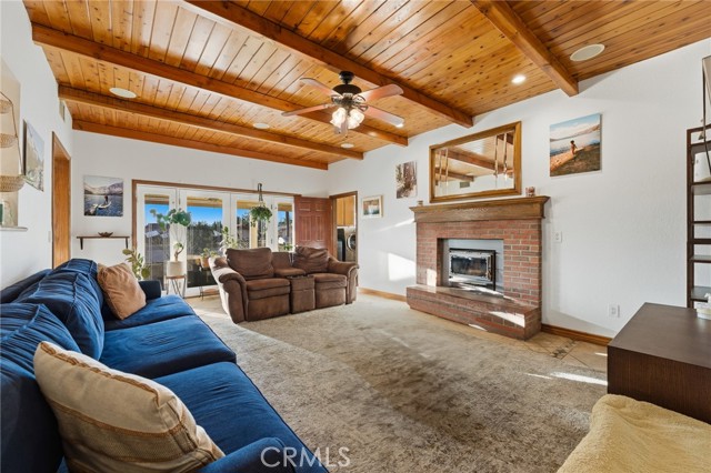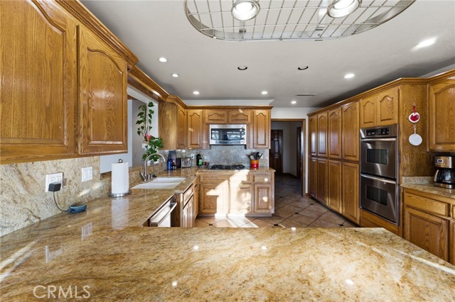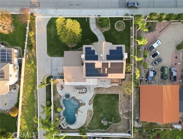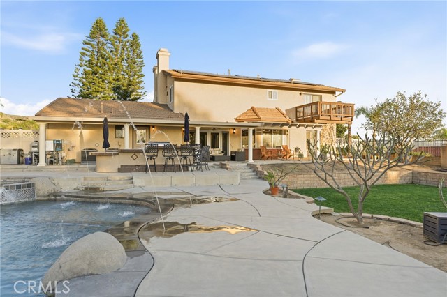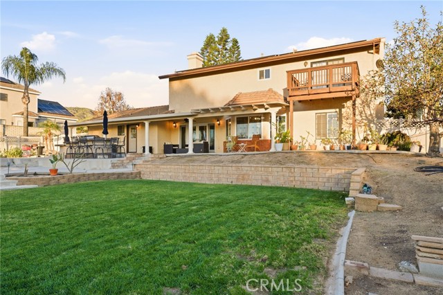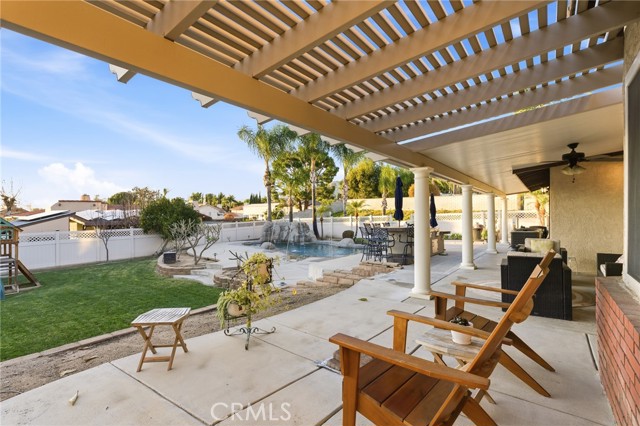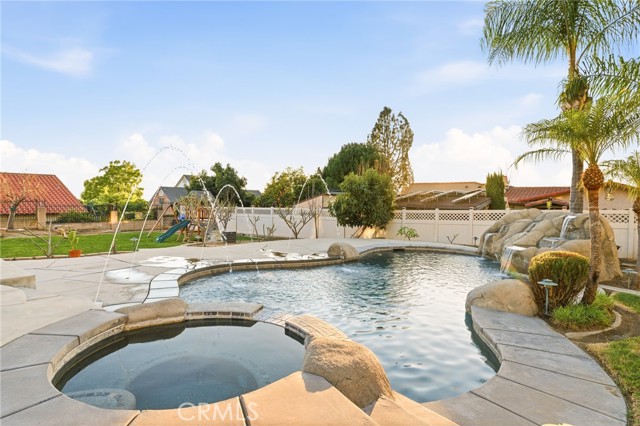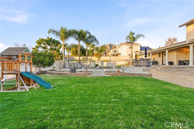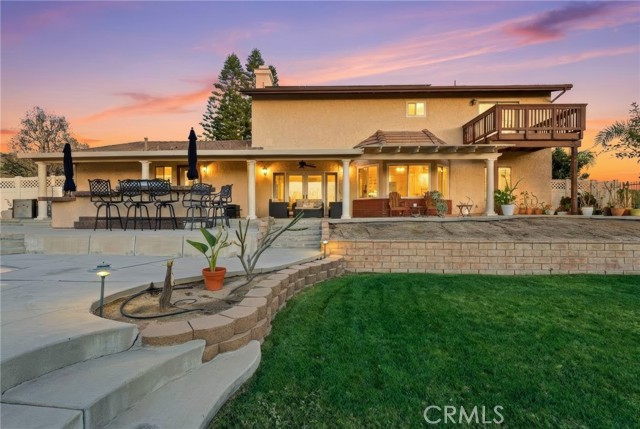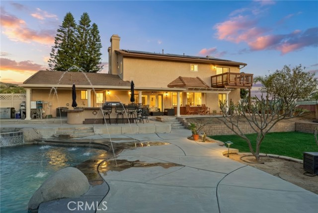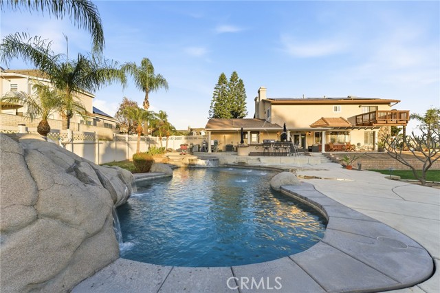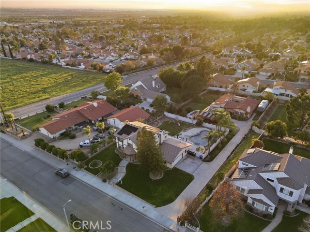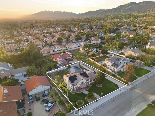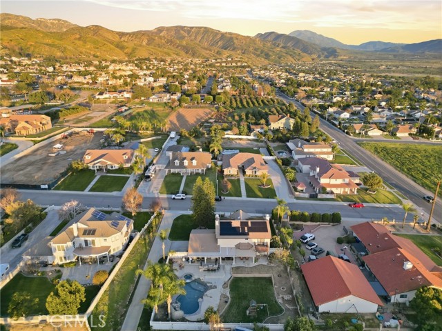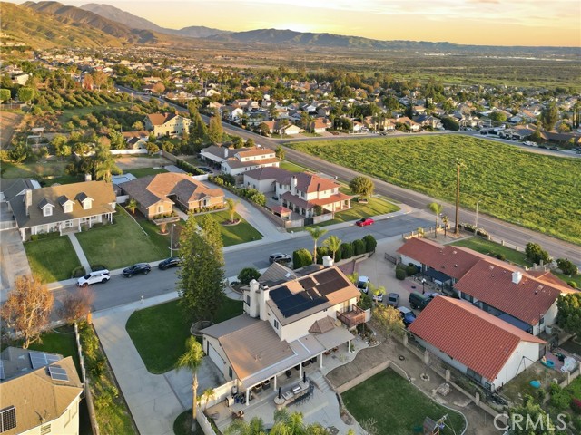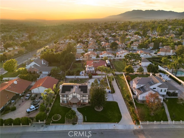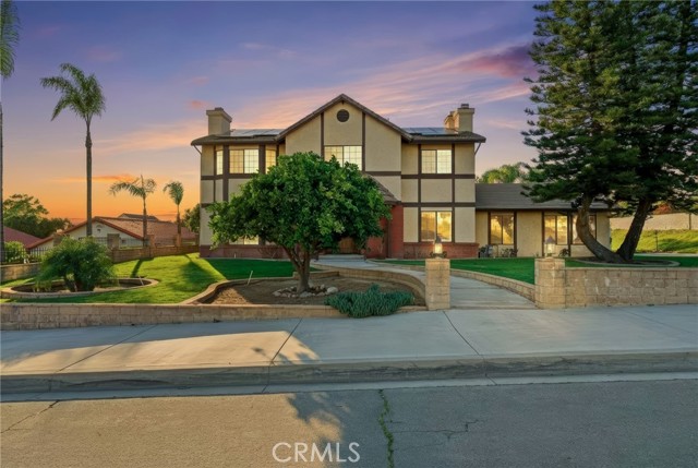 Beautiful custom home located on a large, fully landscaped cul-de-sac lot surrounded by fine properties. The gourmet kitchen features granite countertops, full backsplash, and stainless steel built-in appliances including double oven, cooktop, dishwasher, and microwave. Spacious breakfast nook with decorative etched-glass windows overlooks the rear yard. This home offers a large living room with fireplace, formal dining room, and an inviting family room with wood ceiling, second fireplace, in-ceiling surround sound, and custom French doors leading to the patio. The main level includes a private office with dedicated electrical circuit, half bath, laundry room with sink, and a ¾ bath with direct access to the backyard, pool, and garage. Upstairs features a spacious owner’s suite with fireplace, walk-in closet, soaking tub, and separate shower. Secondary bedrooms include a balcony with stunning sunset and mountain views, a charming window seat, and an additional front-facing bedroom. Plantation shutters and newer ceiling fans throughout. Entertainer’s backyard includes a covered patio, outdoor kitchen island with Fire Magic BBQ and refrigerator, heated in-ground saltwater pool and spa with waterfall, water features, and lighting. Enjoy mature fruit trees including orange, loquat, green apple, peach, Van cherry, pluerry, lemon, grapefruit, and avocado. Additional highlights include an oversized 638 sq. ft. finished side-facing garage, hard-wired internet, security system wiring prepped for cameras, and a great solar plan. Built with quality upgrades including 2x6 framing, 5/8” drywall, shear panel construction, and fully insulated walls for energy efficiency. Award-winning Redlands School District. No HOA and no additional CFD or development bonds.