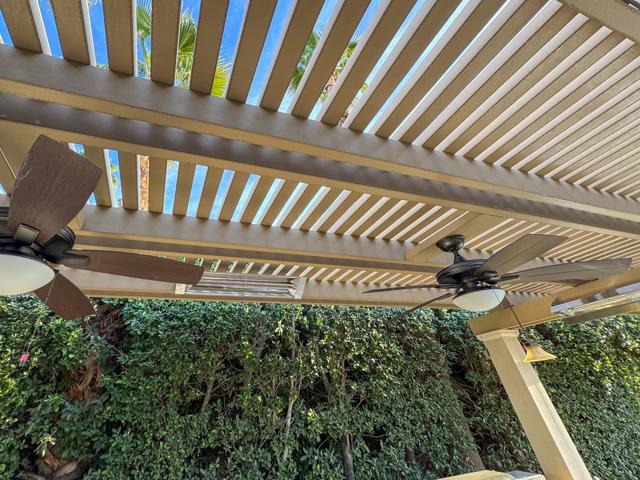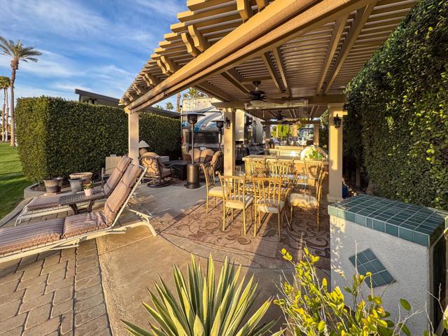 Enjoy breathtaking western sunset views over the golf course from this private and entertainment-ready luxury RV lot. Designed for both hosting and relaxation, it features a beautiful pergola and a spacious outdoor kitchen with stainless steel appliances, a built-in BBQ, a four-burner cooktop, oven, two refrigerators, and a year-old dishwasher. Thoughtfully shaded with no direct sun on the coach window, this lot stays cool while offering ample seating, a fire table, and extra storage.Under the pergola, three ceiling fans provide a cooling breeze, while four heaters, a movable heater, and two mushroom heaters ensure warmth on cooler nights. Hand-crank sun shades and ambient lighting create a cozy atmosphere, perfect for evening gatherings. Pavers extend across the back, offering parking for a car and golf cart, all within a quiet location just a short walk from the pool, hot tub, sauna, and clubhouse. This comfortable lot is the perfect blend of luxury, privacy, and resort-style living.Outdoor Resort Indio is a class A only RV resort in Indio, CA.