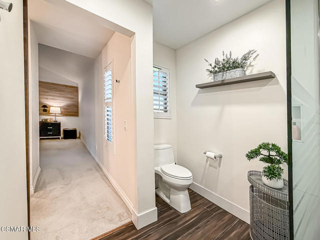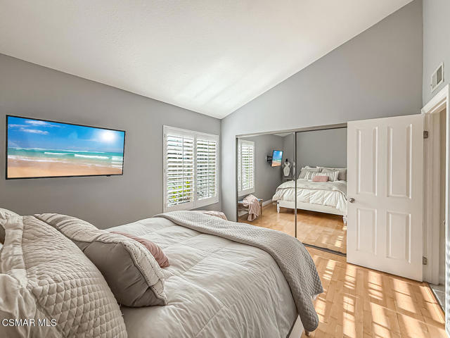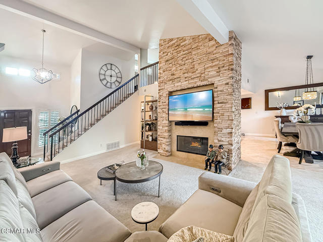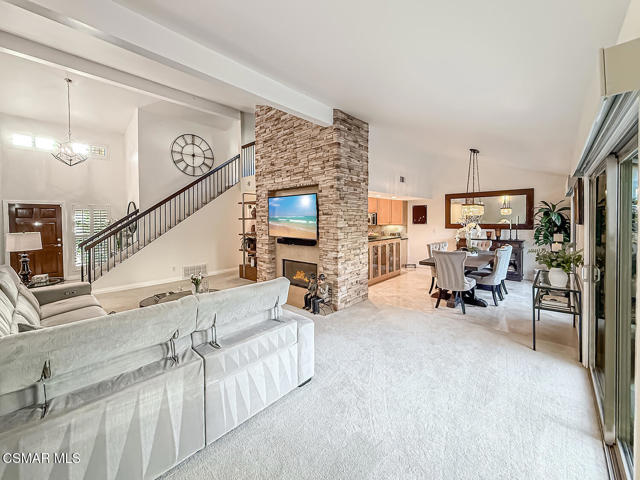 3BR/2.5BA condo in gated Los Robles Estates in Newbury Park. Main-level primary suite + loft. 2-car garage. HOA covers roof/exterior. This attached condominium is located within the gated Los Robles Estates community in Newbury Park and offers 3 bedrooms, 2.5 bathrooms, and approximately 2,148 square feet across two levels. The layout places most daily living on the main floor, with a large open loft upstairs providing flexible additional space.The main level features a vaulted-ceiling living room with a fireplace and sliding doors that open to a private patio, bringing in natural light and extending the living space outdoors. The living room connects directly to the dining area and kitchen, creating a functional and open flow for everyday use. The kitchen offers ample cabinetry, built-in appliances, and convenient access to the dining space.The primary suite is located on the main level and includes double-door entry, a private bath with separate tub and shower, dual vanities, a walk-in closet, and sliding-door access to the patio. Two additional bedrooms, a full bathroom, and a powder room are also on the main floor. An indoor laundry room and direct access to the attached two-car garage add everyday convenience.Upstairs, the open loft overlooks the living area and works well as a bonus room, home office, or secondary living space. The home includes both front and rear patio areas, offering multiple outdoor areas within the unit.The HOA covers the exterior structure and roof. Community amenities include pools, spas, playing courts, and maintained common areas. The air conditioning system is approximately 11 years old, and the home includes a 50-gallon water heater. Monthly HOA dues apply. The location provides convenient access to nearby shopping, dining, and major roadways.
