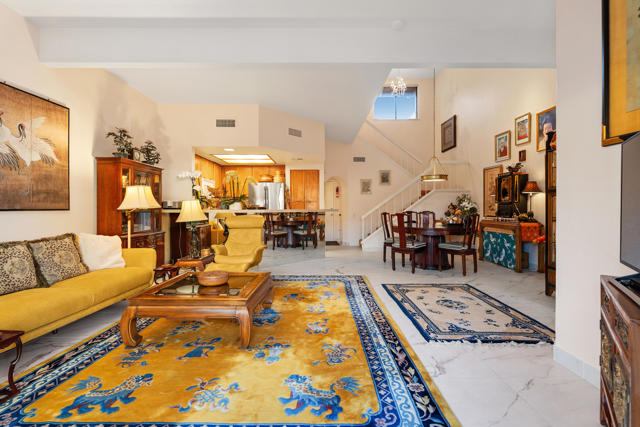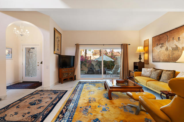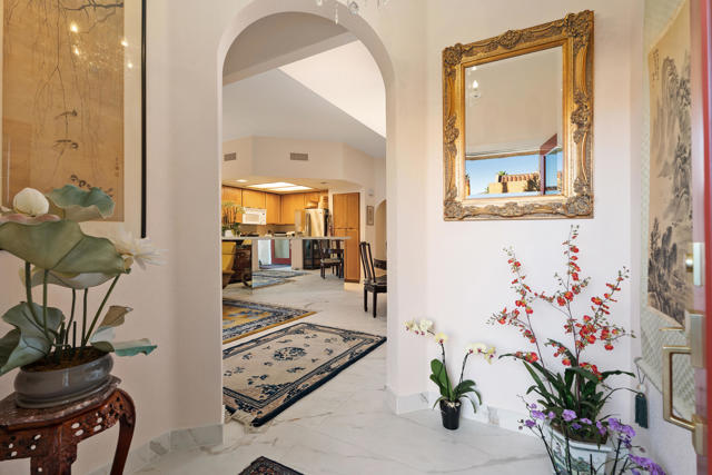 Approximately 1,502 square feet of well designed living space is offered in this two bedroom, three bathroom condo featuring a desirable floorplan. Both bedrooms include ensuite bathrooms, providing comfort for residents and guests alike. The interior has been refreshed with updated porcelain flooring on the main level, new interior paint, and upgraded kitchen countertops, creating a clean and inviting atmosphere filled with natural light. New dual pane sliding doors on the lower level enhance energy efficiency while opening to the private courtyard ideal for indoor outdoor desert living. An oversized two car garage offers ample parking and storage. A defining feature of the residence is the expansive sun deck, accessed from the second level and leading to the uppermost portion of the home. From this elevated vantage point, enjoy sweeping mountain views in every direction, including a direct outlook toward Eisenhower Peak, creating an exceptional setting within this community. Enjoy an active lifestyle at Ironwood Country Club, a private club featuring two 18‑hole golf courses, a fully equipped fitness center, tennis and pickleball courts, and a stunning clubhouse. Membership is by application and requires sponsorship.