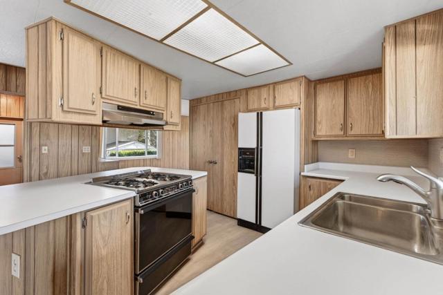 If you love vintage character with modern comfort, this is a must see! Thoughtfully refurbished while preserving much of its original charm, a rare blend of retro character and modern livability. Enter from the new deck with redwood steps, overlooking a peaceful greenbelt and walking path. The open-concept living area features classic paneling, new carpeting, updated windows, and a built-in hutch with integrated lighting that creates an inviting dining space. Fresh exterior paint enhances the homes curb appeal and pride of ownership. Originally designed as a 3-bedroom, one bedroom wall was opened to create a spacious family room area and can be reinstalled if a third bedroom is desired. The updated kitchen offers refreshed finishes while maintaining timeless style, including fresh interior paint, tasteful wallpaper accents, oversized island with gas cooktop, built-in wall oven, expansive pantry, and a vintage wet bar with decorative gold vein mirror panels. The primary suite features mirrored closet doors and an attached bathroom with dual sinks and mirrors and a walk-in shower. Additional features include an interior laundry room with washer and dryer included, refrigerator included, storage shed, and side-by-side two-car covered carport. Well maintained and move-in ready.