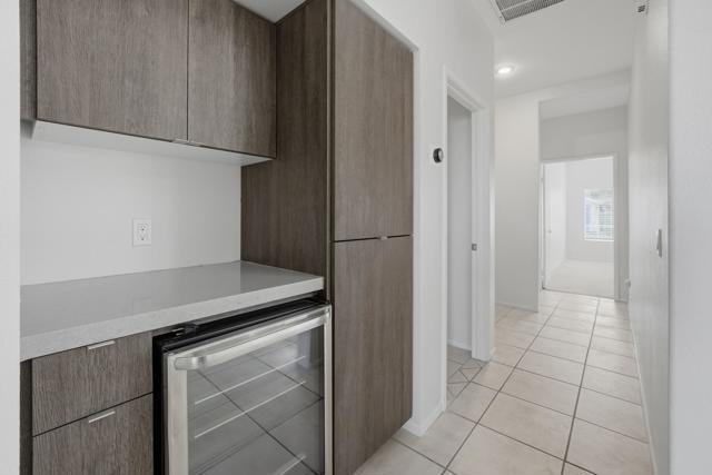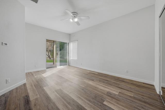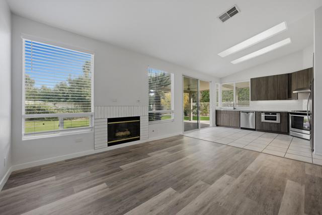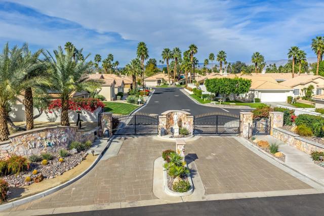 Discover desert living in the coveted, gated Merano community of Palm Desert. This partially upgraded three-bedroom, two-bathroom residence offers a blend of contemporary style and thoughtful functionality in its inviting interconnected design.From the beautifully landscaped front yard, step inside to a bright, flowing living space featuring brand-new vinyl plank flooring in the living room and primary suite, plus a modern fireplace surround that complements the remodeled, modern kitchen. The light and bright kitchen was completely remodeled and features stainless steel appliances including refrigerator and a gas range, modern cabinetry, white ceramic backsplash and white countertops, and opens directly to the private, fully fenced backyard--complete with mature fruit trees and a new aluminum patio cover--creating an ideal setting for indoor-outdoor entertaining. A new dry bar area with beverage refrigerator and matching extra storage cabinetry was added in the hallway. The highly desirable three-bedroom model provides comfortable retreats, including a primary suite with a spacious walk-in closet, upgraded ensuite bath with new cabinetry and an oversized shower updated with premium finishes, and a glass slider leading to the landscaped backyard. The secondary bath, conveniently accessible for guests, also features updated cabinetry.Additional highlights include a direct-access two-car garage and remarkably low HOA fees in this gated enclave.Perfectly positioned in the heart of Palm Desert, you're just moments from Bristol Farms, Eisenhower Health, Starbucks, exceptional dining, world-class golf, and more. This is charming, convenient neighborhood living--schedule your private showing today!