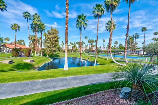 Wonderful home in the beautiful Desert Sands mobile home community. This home sits on one of the best lots in Desert Sands...beautiful view of the lake, club house, tennis & pickle ball courts. There is a two car garage with direct access to the house, a large kitchen, two dining areas, a bar. a living room and family room area...The large primary bedroom has french doors overlooking the lake, a walk-in closet, and a bathroom with a shower and tub...The owners put in a very large raised cement patio with room for a patio set, and BBQ. Plenty of room for a large family gathering, or a party...the clubhouse boasts a pool, spa, gym, and card room. This is a great place to live!