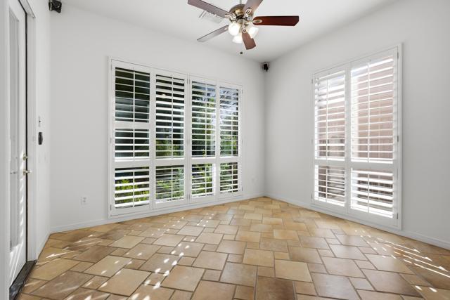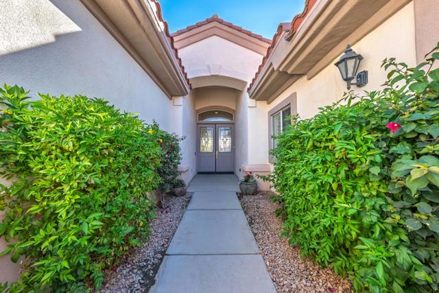 Sun City Palm Desert - Monaco (Extended). Located on a quiet cul-de-sac. this extended Monaco offers exceptional flexibility with three extended suites, including a rare double guest suite -- ideal for hosting guests or accommodating an in-home caregiver. The oversized east-facing rear yard is a true highlight, featuring a pool and spa surrounded by an expansive flagstone patio, lush landscaping, and a built-in BBQ island -- perfect for entertaining or relaxing in privacy. The gated front courtyard and leaded glass entry doors create inviting curb appeal. Inside, 12-foot ceilings elevate the greatroom, while mosaic tile and Pergo flooring, along with plantation shutters throughout, provide a cohesive and upgraded finish. The kitchen is designed for both function and gathering, featuring composite counters, a large island with breakfast bar, double wall ovens, a spacious pantry, and a skylight that fills the space with natural light. The extended primary suite offers direct access to the rear patio, a walk-in closet with built-in storage plus a bonus closet. The ensuite bath includes dual sinks with a sitting vanity, a walk-in shower, and a separate stall shower with textured glass doors. The double guest bedroom suite includes a wet bar, two closets, and a private bath with shower/tub combination. The additional extended guest suite also has its own shower/tub bathroom. A separate utility space or office adds even more versatility. The 2+ golf cart garage includes built-in cabinetry and overhead hanging rack storage. One AC unit was replaced in 2025, the other in 2013. A rare extended Monaco offering space, privacy, and resort-style outdoor living.