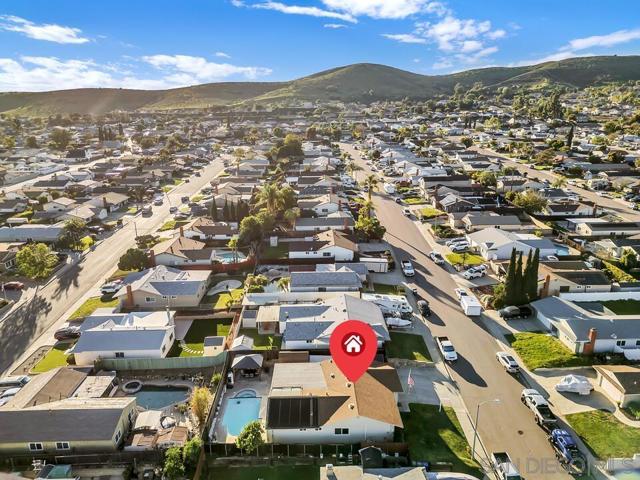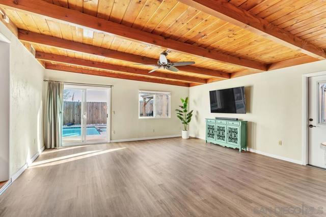 Discover a perfect blend of Southern California throughout this beautiful home. The exterior boasts mountain views and open sky across a manicured lawn. The back offers the intimacy of a private cabana with sparkling pool heated by solar panels steps away from fruit trees. The side yard is a perfect area for trailers, toys, or additional storage with a large access gate to the front. From the moment you arrive, you’ll feel the pride of ownership throughout this great home. Step inside to a light filled interior featuring an open floor plan and luxury vinyl plank flooring that creates a modern, cohesive look from room to room. Enjoy the private living room away from the everyday business, welcomed by views of the surrounding mountains all from the comfort of your home. Then explore the open concept layout flowing effortlessly into the kitchen, where the bar top seating creates the perfect hub for entertaining, casual dining, or keeping everyone connected while you cook. The spacious family room immediately draws you in with its striking wood beamed ceiling, adding warmth, charm, and timeless character. This inviting space is ideal for relaxing evenings or lively gatherings. Whether you're hosting friends or enjoying a quiet night at home, this layout was designed for both comfort and connection. All of this, set in the heart of Santee, makes this home an incredible opportunity you won’t want to miss.
