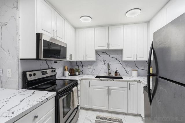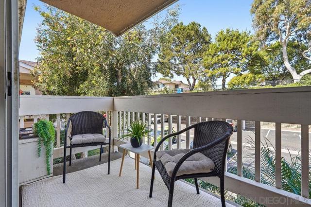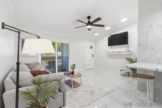 Move-in ready top-floor condo in a quiet, pet-friendly Mira Mesa community. This bright 1-bedroom home features high cathedral ceilings that make the living space feel open and airy. Recent updates include fresh neutral paint, professionally painted kitchen cabinets, new bathroom fixtures, and adjustable LED lighting throughout. The main living areas have clean tile flooring, while the bedroom has vinyl plank floors, a sizable walk-in closet and an additional overhead crawl space. Outside, the tree-shaded balcony offers a private spot to relax along with an extra storage closet. This unit comes with an in-unit washer and dryer combo plus a reserved covered parking space. Location is everything here, as you are within walking distance to Miramar College and Hourglass Park, and a short drive from major employment hubs in Sorrento Valley, UTC, and Torrey Pines. Easy access to I-15 and I-805 makes for a simple commute. Great potential for rental income, military buyers, or first-time owners. Buyer to verify VA or FHA eligibility.