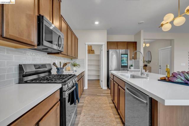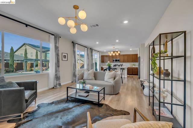 Welcome to your dream home, where modern living meets effortless sophistication. Set on a premium 6,639 sq. ft. lot, this stunning home offers endless possibilities-host gatherings, add a pool, or create an ADU tailored to your needs. Inside, every detail shines with elegance and practicality. The open-concept kitchen, dining, and living areas boast upgraded laminate flooring, high-end appliances, chic West Elm lighting, and custom drapery. A walk-in pantry offers ample storage space. With 3 spacious bedrooms and 2.5 beautifully designed baths, including a serene primary suite with a walk-in closet, comfort is at every turn. A versatile loft with upgraded laminate flooring adds flexibility-perfect as an office, cozy retreat, or potential 4th bedroom. Sustainability and convenience come standard with owned solar panels and a Tesla-ready garage. The pre-installed security cameras provide added peace of mind. The gated community offers an array of amenities: a sparkling pool, stylish clubhouse, parks, playgrounds, a pickleball court, and BBQ area. Located in the sought-after Brentwood school district, the home is just minutes from Costco, Trader Joe's, the Streets of Brentwood, and more, with easy access to Highway 4 and Antioch BART for stress-free commuting.
