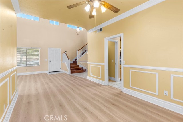 Welcome to this beautifully designed 4 bedroom, 3 bathroom home in the heart of Lake Elsinore. With a rare and versatile floor plan, you'll find 2 bedrooms and a full bath conveniently located downstairs, perfect for guests, multigenerational living, or a home office setup. The living room features a cozy gas fireplace and flows seamlessly into the main living area, creating a warm and functional space for everyday living and entertaining. Upstairs offers 2 additional bedrooms and 2 full baths, including a spacious primary suite complete with a private balcony. The primary bathroom features a walk-in-closet. Step outside to a covered patio and low-maintenance backyard designed for relaxation without upkeep.