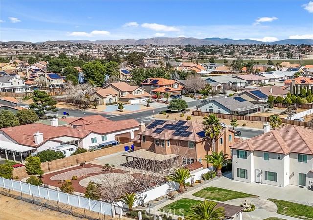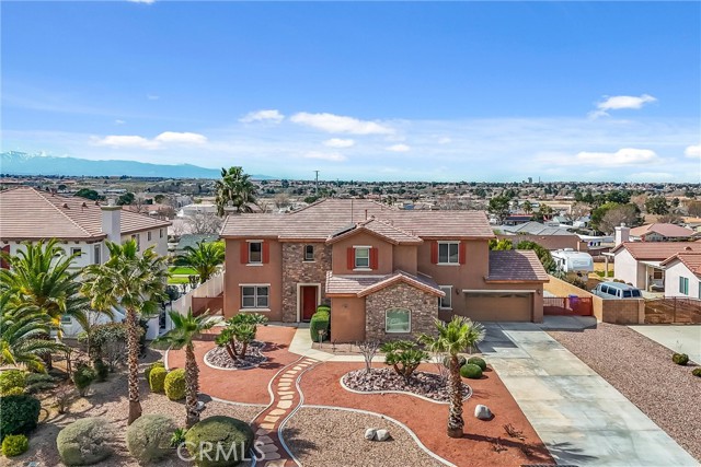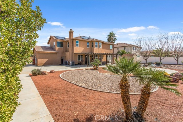 Experience the ultimate in high-desert luxury with this stunning 5-bedroom, 4-bathroom estate, where panoramic mountain views meet unparalleled craftsmanship. This Apple Valley gem welcomes you with rich hardwood flooring and elegant granite countertops throughout. The expansive floor plan is designed for modern living, featuring a convenient main-floor bedroom and an upstairs layout that is nothing short of spectacular. The primary master suite is a true sanctuary, spanning the entire length of the home with his-and-her walk-in closets, while a newly added second mini-master upstairs ensures comfort and privacy for guests or family. Every additional bedroom on the second level also features its own walk-in closet, providing ample storage for everyone. The exterior of this property is a private oasis designed for both relaxation and grand-scale entertaining. Crowned with an advanced solar infrastructure, the home maintains a climate of absolute comfort even on the brightest days, marrying architectural elegance with a commitment to renewable sophistication.. Step out onto the brand-new, fully lit patio cover that leads to a beautifully landscaped yard, complete with a soothing waterfall feature and a cozy fire pit perfect for crisp evenings. As the sun sets, the property transforms into a resort-style retreat with decorative night lights illuminating the entire perimeter. For the hobbyist or organized homeowner, the backyard includes a dedicated shed fully equipped with lights, while the massive 4-car garage and spacious RV parking provide plenty of room for all your vehicles and toys. Located just minutes from the equestrian center, local parks, premier shopping, and dining, this home offers the perfect balance of peaceful seclusion and community convenience.