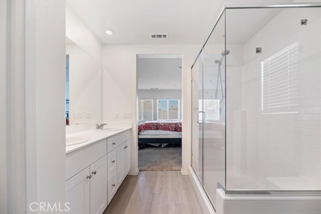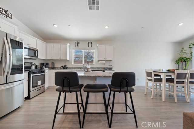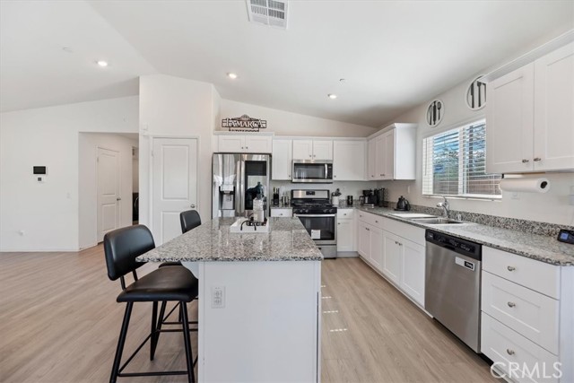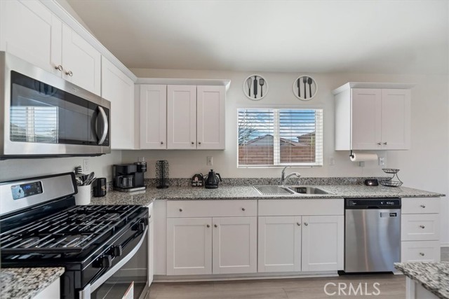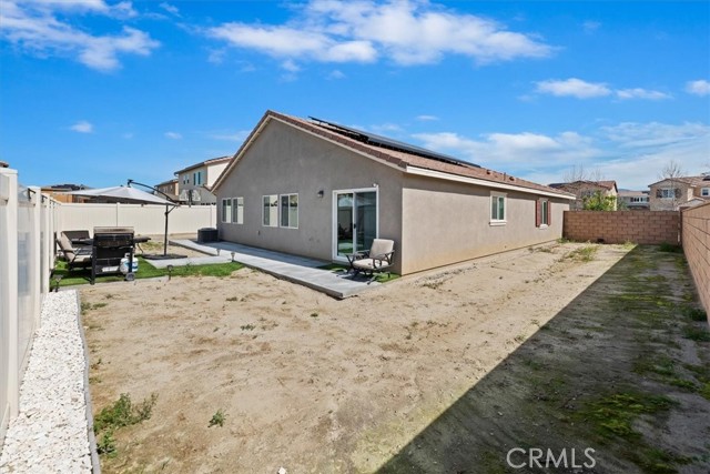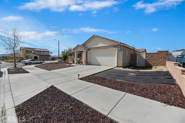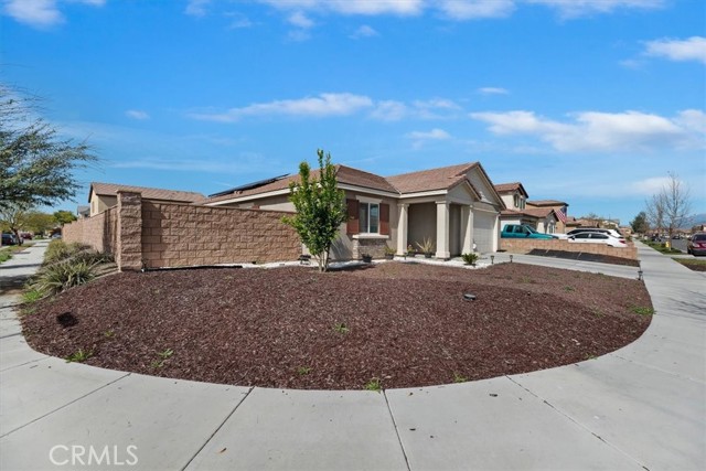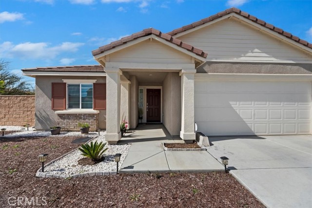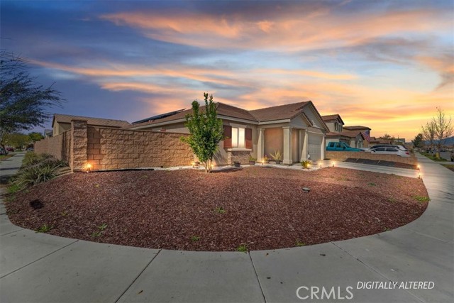 Beautiful 4 bedroom 3 bath single story home on a corner lot in a wonderful Hemet neighborhood! Built in 2022. PAID for solar! 1897 square feet of gracious living! Move in ready! Walk in through the covered front porch area and find a wide open floor plan! HUGE great room with vaulted ceiling, room for a computer workspace and recessed lighting. The gourmet kitchen features granite countertops, lots of glimmering wood cabinets, pantry, upgraded stainless steel appliances including gas stove, dishwasher and built-in microwave! The kitchen island also doubles as a breakfast bar. There’s a formal dining area off the kitchen/great room area. The spacious primary suite has lots of room for all your bedroom furniture! The primary bathroom has a large walk-in shower, double sinks in the vanity, private commode area and a big walk-in closet. The other 3 bedrooms have lots of room and one even has a walk-in closet. There are 2 other bathrooms, one with a tub/shower combo unit and the other with a walk-in shower. The indoor laundry room is centrally located. The bedrooms are all carpeted and the remaining areas of the house have easy care laminate flooring. Central air and heat. Concrete tile roof. Walk out your sliding glass door to the big backyard with lots of upgraded concrete, a BBQ area and a combination of vinyl and block wall fencing. The front yard has water-wise landscaping. 2 car garage with roll up door and automatic opener. The garage is fully finished inside. 13 panel solar system, fully paid for, to help with your electric bills! The HOA is only $98 per month and this house is a short walk from a beautiful park with a covered kids play area, covered picnic tables, built in cornhole courts and lots of grass area to play in! Please check out all the pictures and give Steve a call to arrange your private showing. This property will not last!