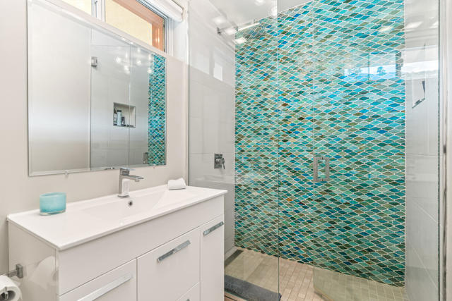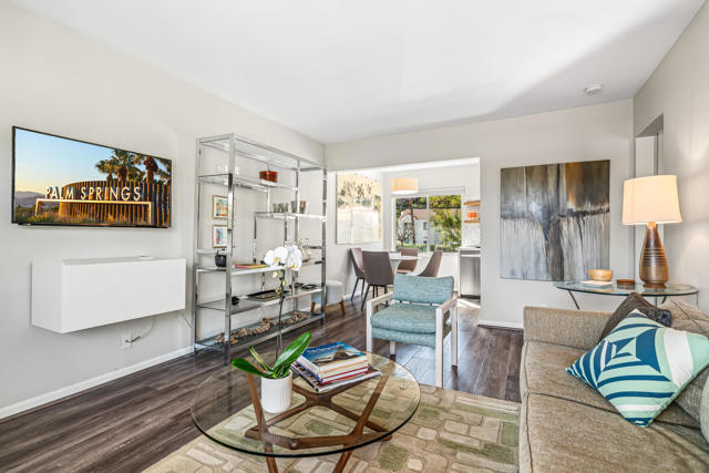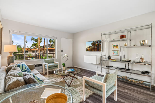 The perfect Palm Springs pied a Terre! Welcome to unit 17 at Desert Skies, one of South Palm Springs' most recognized midcentury (1958) intimate enclave of just 38 units on fee simple land ( you own it) in the Indian Canyon neighborhood within minutes of downtown with its shops, entertainment, restaurants and hiking trails with stunning views of the San Jacinto Mountains as a backdrop. This top floor unit located on the West side of the complex is sure to tug at your heartstrings with its thorough and stylish renovation. This 1 bed /1 bath floor plan features an open layout with a bright & airy feel. Cook a delicious meal in the fully updated kitchen with new cabinetry, slab quartz counter tops, tiled backsplash and stainless appliances including a gas stove. Relax in the spacious bedroom with a sizeable walk-in closet for plenty of storage. The spa-like bath boast a new vanity, a stunning tiled walk-in shower and updated fixtures. Enjoy additional peace of mind with a new electric panel, some recessed lighting, new heating /cooling wall units, double pane windows, ceiling fan and easy to care for laminate flooring throughout. Residents enjoy two sparkling pools (one heated seasonally), a spa, BBQ area, two community rooms, assigned parking and onsite laundry facilities as well as secured bike storage. Looking for some additional income? The HOA allows 14-day minimum rentals, offering more flexibility to seasonal tenants. The monthly HOA dues include water, trash, gas, and general maintenance of the community (landscaping , roof , paint). Furniture / contents negotiable. This little gem is just ready for your enjoyment...a little piece of paradise part of Palm Springs iconic mid-century architectural history.
