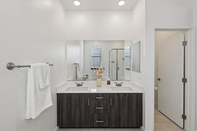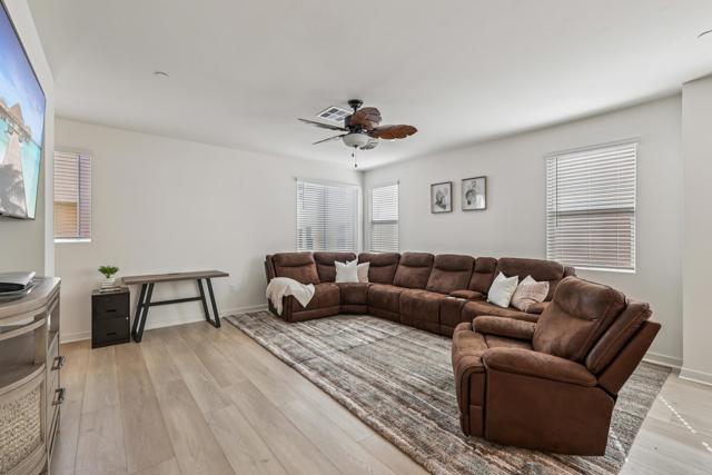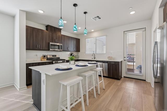 Built in 2022, this bright corner-unit townhome with owned solar offers modern construction, energy efficiency, and a highly desirable floor plan. The home features a bedroom and full bathroom on the first floor, perfect for guests, multigenerational living, or a home office. The open-concept living space is filled with natural sunlight and flows into a spacious kitchen with a walk-in pantry, ample cabinetry, and access to a private balcony. Upstairs, the primary suite features an en-suite bathroom and a generous walk-in closet, creating a comfortable retreat. A dedicated laundry room and attached 2-car garage add everyday convenience. Located in a VA-approved community with a resident sitting area, this home is surrounded by nearby parks that bring the community together. Conveniently located with easy freeway access, approximately 20 minutes from Downtown San Diego and Coronado Beach. Modern, move-in ready, and designed for flexible living.