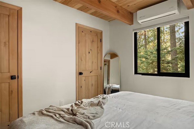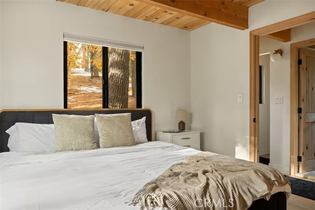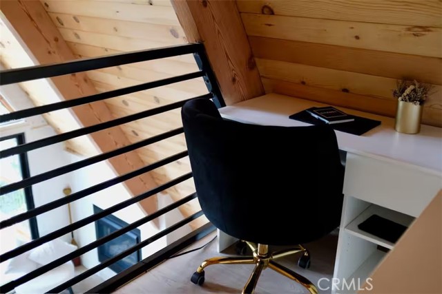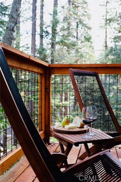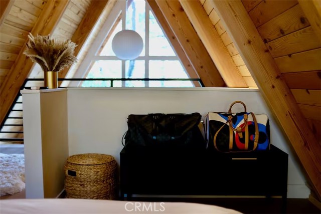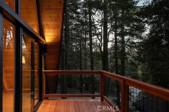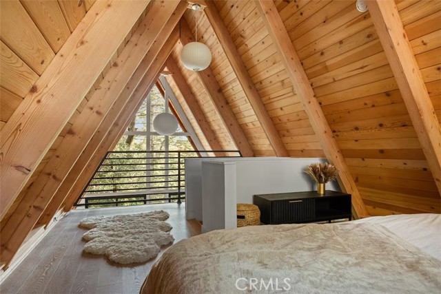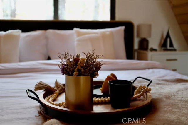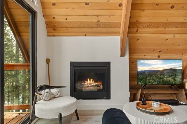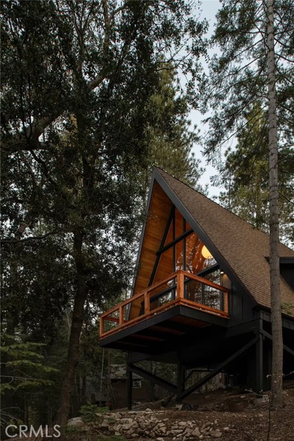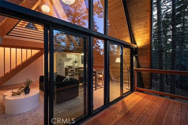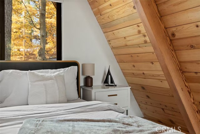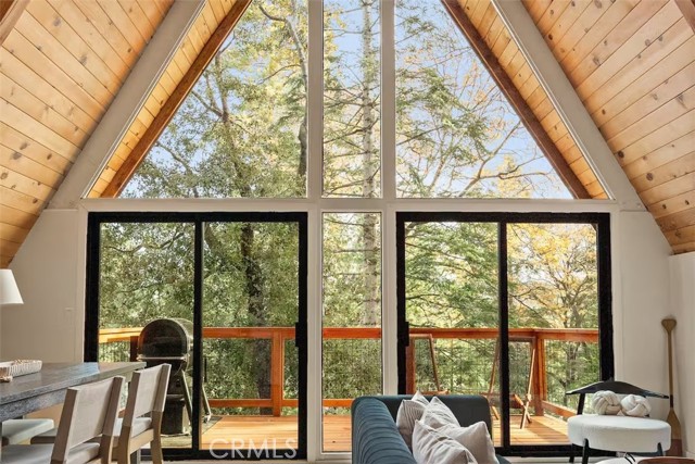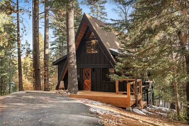 Welcome to 26664 Thunderbird Drive — a beautifully reimagined A-frame retreat nestled among the pines in the desirable Arrowhead Woods community. Set on nearly 0.4 acres of usable forested land, this 2-bedroom, 1-bath cabin with loft blends timeless mountain charm with elevated modern design. Step inside to soaring vaulted ceilings, a dramatic wall of windows, and an open-concept great room filled with natural light. The inviting living area features a sleek gas fireplace and flows seamlessly into the fully renovated kitchen complete with custom plaster countertops, curated finishes, and stylish retro-inspired appliances. The main level offers a comfortable bedroom along with a thoughtfully designed bathroom showcasing a curbless walk-in shower with handcrafted Zellige tile, radiant heated floors, and a modern bidet. Upstairs, the spacious loft functions as the second bedroom and includes a cozy office nook—perfect for working remotely or hosting guests. Additional upgrades include a dedicated laundry/mudroom, ductless A/C, updated lighting, plumbing, and electrical systems, making this home both stylish and functional year-round. Enjoy mountain living outdoors on the expansive deck overlooking a peaceful forest setting, ideal for morning coffee or evening gatherings. The oversized lot offers space for expansion, gardening, or adding a spa, while the circular driveway provides generous parking for multiple vehicles, RVs, or trailers. With coveted Lake Arrowhead lake rights and just minutes from Lake Arrowhead Village, hiking trails, the country club, and nearby ski resorts, this turnkey property is perfect as a full-time residence, weekend escape, or income-producing short-term rental.