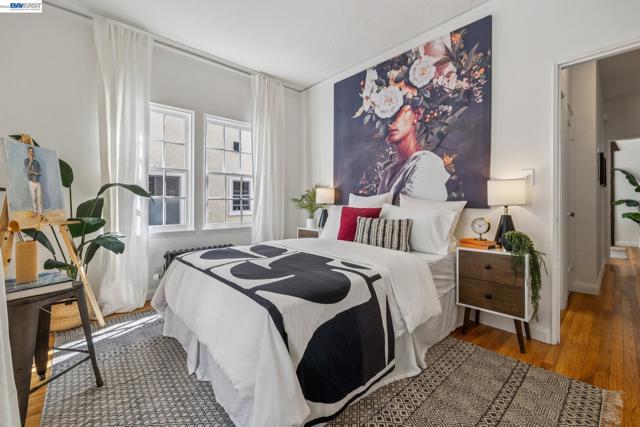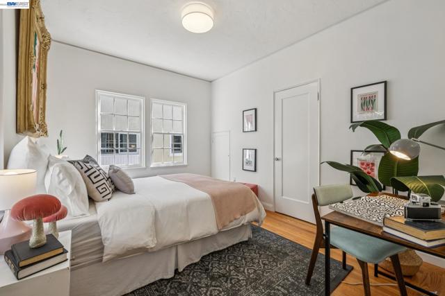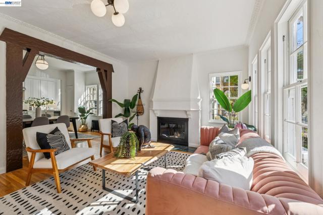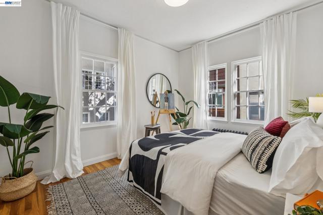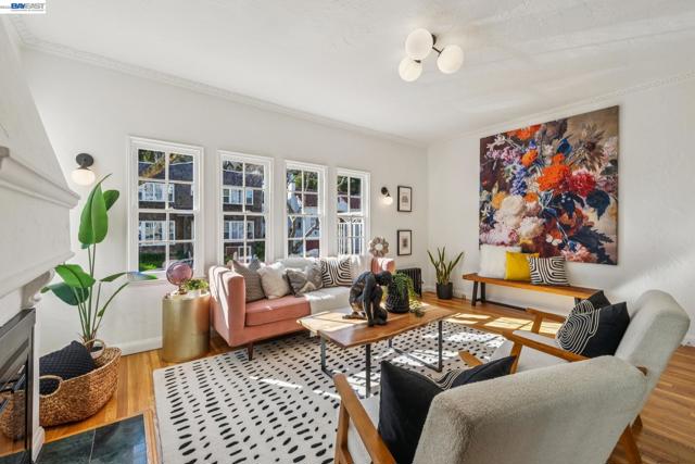 Old-world elegance meets modern living in this updated 2BD/1BA condo in a coveted North Berkeley neighborhood. Set on a picturesque tree-lined street, the charming 1929 building showcases classic architecture near world-class amenities. This second-floor 950 SQFT home fills with sunlight through mullioned windows, while crown molding and refinished hardwood floors add warmth and character throughout. Relax or entertain in the gracious living room, where a vintage plaster fireplace anchors the space. A Tudor-style wood arch leads to the formal dining room, perfect for gathering with friends. The updated kitchen pairs modern cabinetry and quartz countertops with timeless black-and-white tile. The hall bath echoes the style with classic tilework, newly glazed tub with shower, and a new vanity. A sunny rear bedroom features a cedar closet, while upstairs a second bright bedroom—also with cedar closet—offers privacy and flexibility for guests or a home office. Additional storage, backdoor access, shared laundry, and dedicated garage parking add convenience. Just two blocks from UC Berkeley, with dining, shopping, and the East Bay Parks close at hand, this home places you at the center of it all.