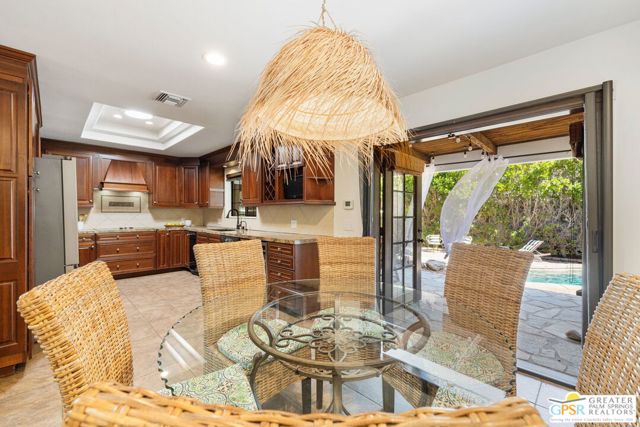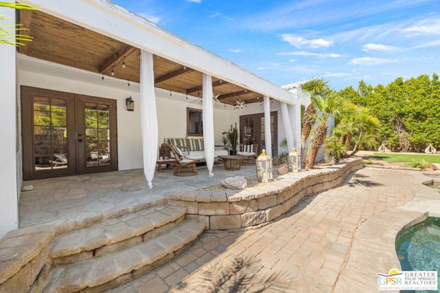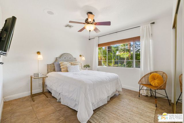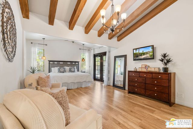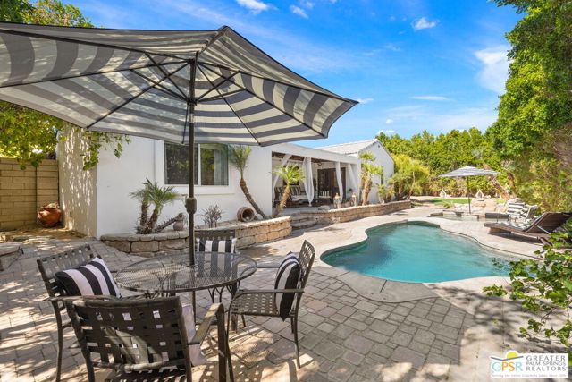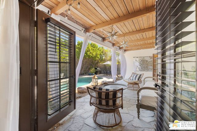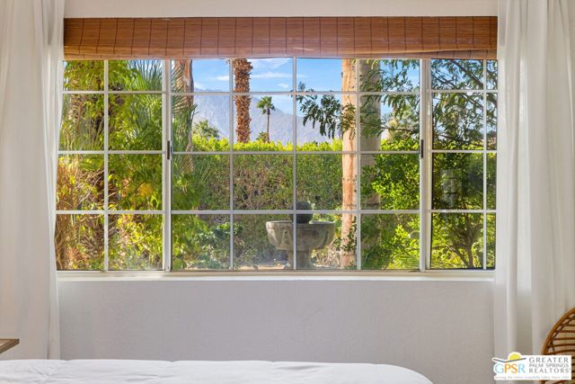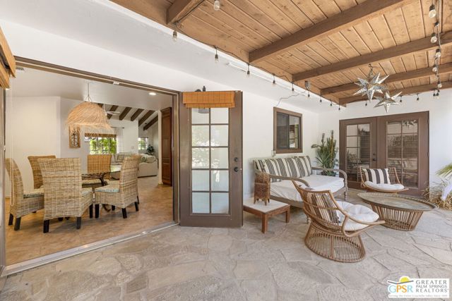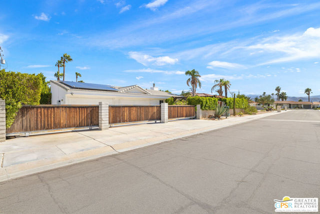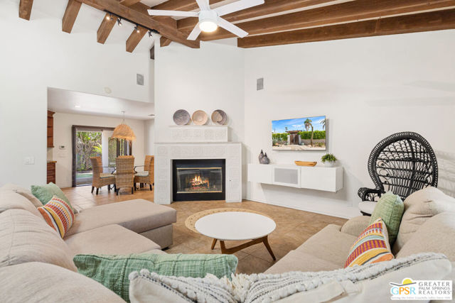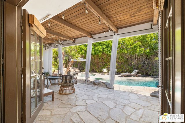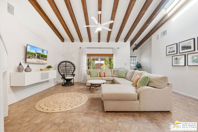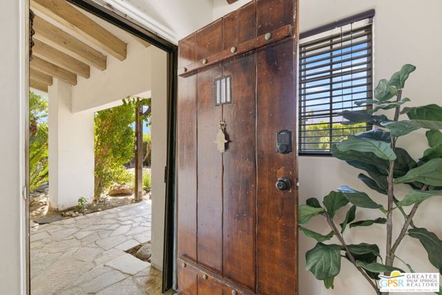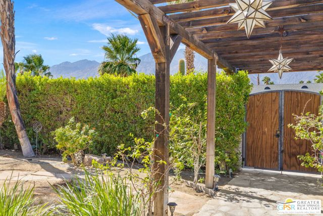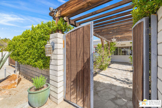 DESERT HIDEAWAY! Walled and gated for seclusion, this FURNISHED three bedroom, three bath ranch style residence unfolds with tall beamed ceilings, warm textures, and an easy indoor outdoor rhythm. Beyond the walk gate, a pergola draped in bougainvillea sets a romantic arrival framed by mountain views to the west. The front porch hints at the character within where the living room showcases a handmade Moroccan tiled fireplace, clerestory skylight, and those signature beams overhead. The dining area and kitchen open to an elevated veranda overlooking the pool and spa, a sun drenched setting designed for the desert good life. Pebble finished pool with its playful bridge, generous patio space, and multiple lounging zones create a relaxed resort atmosphere, complete with a newer BBQ ready for entertaining. The primary suite features vaulted ceilings, two closets including a large walk in, and direct pool access. Guest quarters enjoy thoughtful separation with one ensuite and another capturing the San Jacinto view. Newer copper plumbing in place from 2022. Tesla leased rooftop solar system in place. Set within Desert Park Estates on fee land, you own it. The generous lot and covered parking for four cars behind the drive gate complete this inviting Palm Springs retreat. Uptown Palm Springs and its vibrant scene are a short hop away.