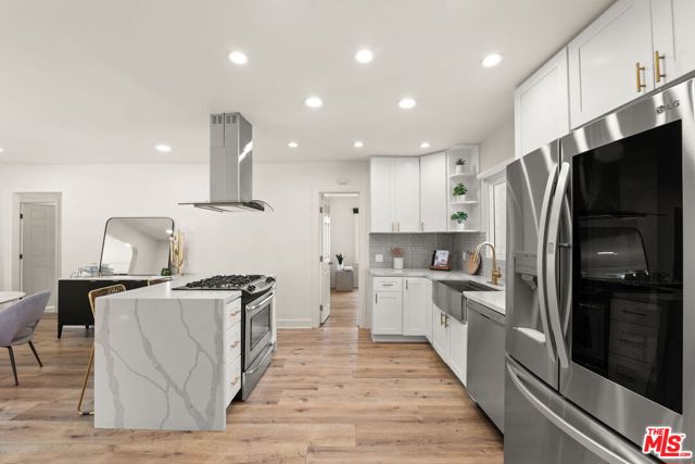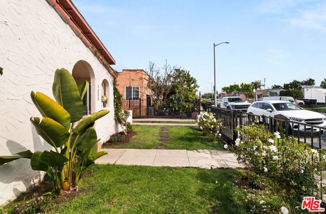 Welcome to this charming home set on a peaceful South LA street! This Spanish-style property blends character with modern interior upgrades and spacious outdoor living. From the moment you arrive, blooming bougainvillea and fragrant white jasmine draped across the arched entry creates a soft, inviting curb appeal. Year-round iceberg roses beautifully border the front of the property, adding color and elegance in every season. Upon entry, the 3-bedroom, 1-bath main home offers a light abundant, open-concept living, dining, and kitchen layout designed with functionality and modern design. Recessed lighting, and wood-like flooring enhance the warm, inviting feel. The open entertainers kitchen is anchored by a beautiful waterfall quartz countertop complemented by sleek cabinetry and stainless steel appliances. A dedicated back laundry room adds convenience, while the detached 1-bedroom, 1-bath back unit provides valuable flexible bonus space which can be used as a guest quarters, office, studio, or later converted into a detached ADU. The backyard is a large private sanctuary featuring a spacious lawn and mature fruit-producing avocado, peach, lime, and grapefruit trees. In addition, an array of thriving herbs and chile garden sits just steps from the kitchen, providing for a truly diverse garden set up. Additional highlights include a 200-amp upgraded electrical panel, blackout window shades, wireless built in speaker system in both bathrooms, Rachio system used to control the sprinkler system timers, upgraded laminate wood flooring in back unit, and Level 2 EV charging capability conveniently located in the front gated driveway. With its combination of architectural character, functional interior design, and large outdoor space, this South LA Spanish style property is the kind of home that doesn't come along often.