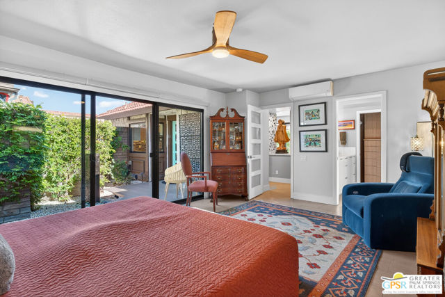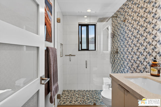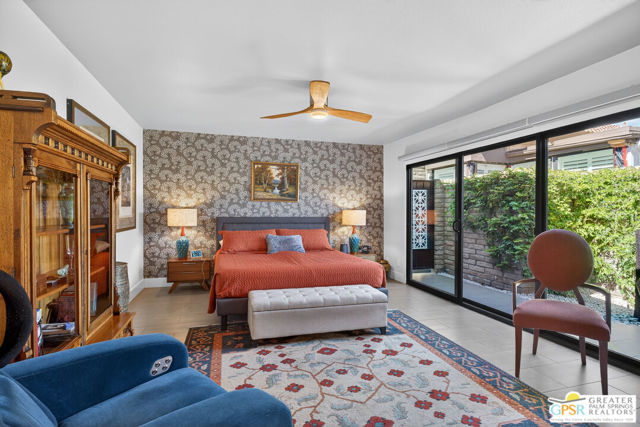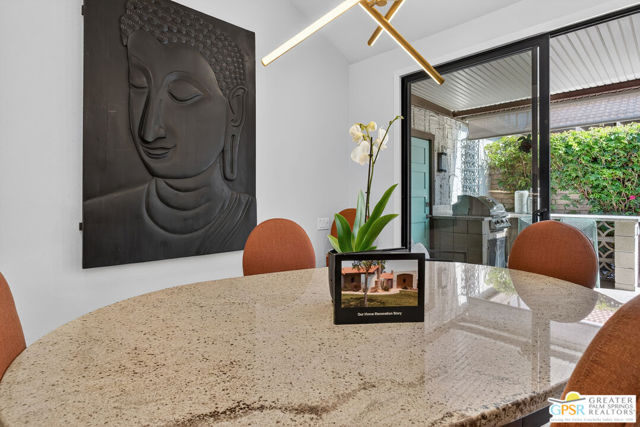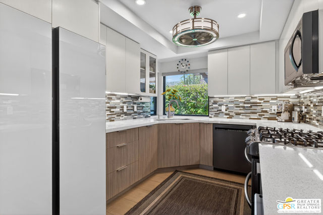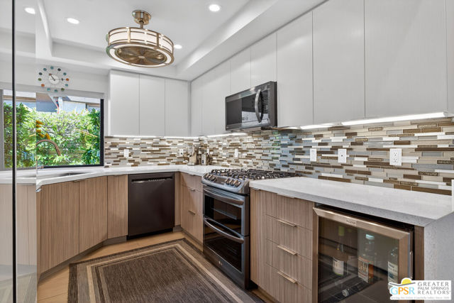 Located in desirable South Palm Springs, this extensively renovated single-level residence with an attached two-car garage offers a rare combination of thoughtful architectural redesign, modern systems upgrades, and high-quality custom finishes. Unlike many homes, this residence features no shared living-area walls, providing added privacy and comfort. Originally reimagined in 2020, the renovation went far beyond cosmetic updates. The interior was architecturally reconfigured to improve flow and functionality, including raising the hallway ceiling approximately six inches after duct removal, eliminating the original HVAC closet, expanding the secondary bedroom closet, and converting the second bedroom into a private en-suite retreat. All popcorn ceilings were removed, creating a clean and modern aesthetic throughout. The redesigned kitchen features custom two-tone cabinetry, soft-close drawers and doors, deep storage drawers, built-in spice storage, integrated trash and recycling, an LG gas range with double ovens, an under-counter beverage refrigerator, and a new KitchenAid dishwasher (2026). The expanded layout creates an ideal space for cooking and entertaining. Both bathrooms have been fully remodeled with custom cabinetry, extensive tile work, lighted mirrors, quiet exhaust fans, and built-in storage organizers. Modern comfort is ensured with energy-efficient mini-split HVAC systems installed in each bedroom and two in the great room, along with an upgraded electrical panel, new windows and sliding doors, and a gas water heater replaced in 2020. Interior features include a modern electric fireplace with tiled surround, recessed dimmable lighting, acoustic wood panel accents at the entry and hallway, remote-controlled window treatments, and custom closet organizers in both bedrooms. Matching indoor and outdoor tile flooring creates a seamless indoor-outdoor flow. Outdoor spaces were thoughtfully enhanced with an expanded entry walkway, landscape lighting, faux basalt fountain, rear aluminum patio cover, and built-in gas BBQ with granite counterperfect for enjoying the Palm Springs lifestyle. The finished garage includes a raised washer and dryer for easier access, a laundry sink, full wall built-in storage cabinetry, a steel ceiling storage rack, and LED lighting. This home represents a true architectural modernization rather than a simple remodel, offering upgraded systems, improved design, and move-in ready convenience in one of Palm Springs' most desirable locations.