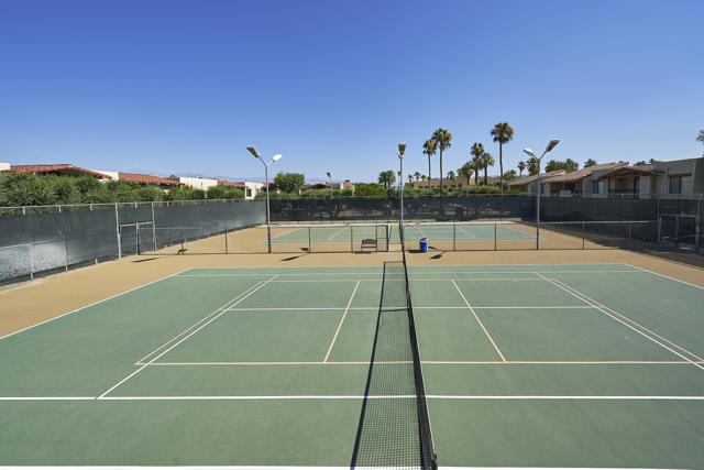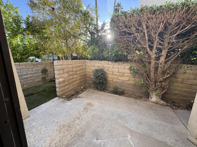 Welcome to this beautifully updated 2 bedroom, 2 bathroom first-floor end-unit condo in the gated Ranch Club community. This inviting home offers a bright and comfortable living space with thoughtful updates including a new dishwasher and garbage disposal. Freshly painted with smooth ceilings, Carpet and tile floors professionally cleaned. The primary ensuite features sliding glass doors that lead directly to a private patio, creating a peaceful space to relax and enjoy the outdoor setting. The desirable end-unit location provides added privacy and extra natural light. The home also includes convenient covered parking.Ideally located near shopping, dining, and everyday amenities, Ranch Club offers both comfort and convenience. The low HOA provides excellent value and includes water, trash, Spectrum cable TV, and high-speed internet, Fitness room, community room, BBQ area, pool and tennis, making this a great opportunity for easy desert living. You own the land not on leased land.
