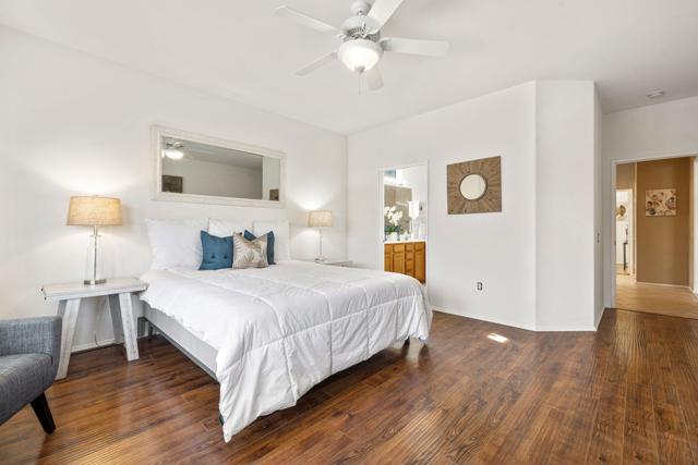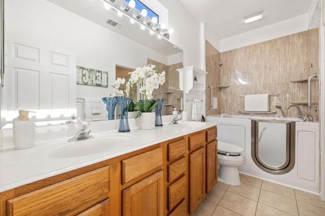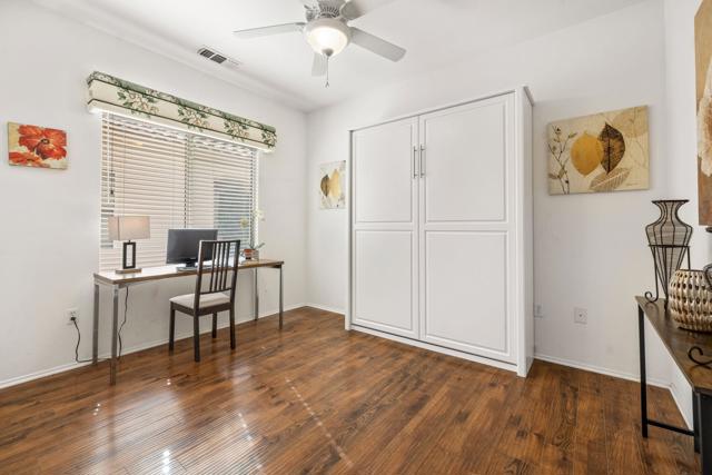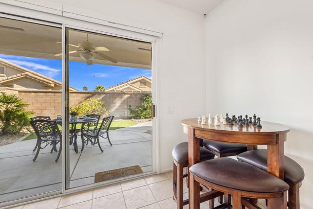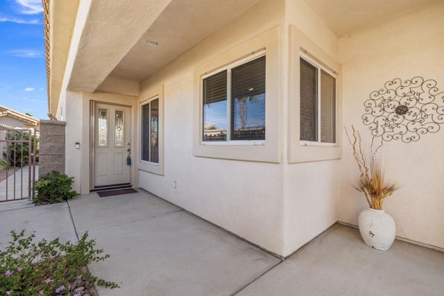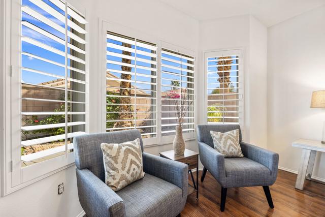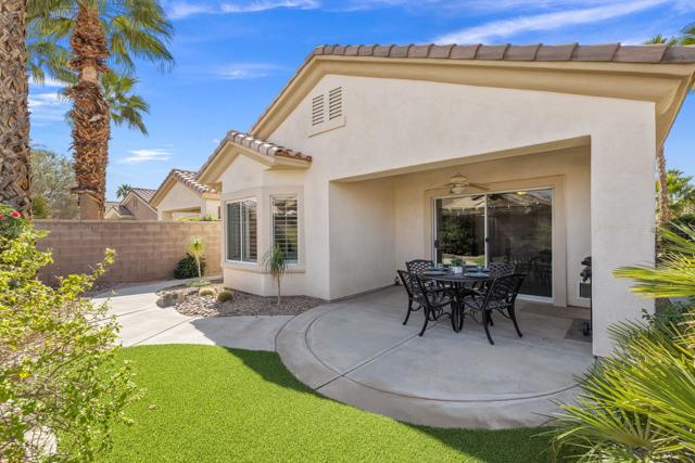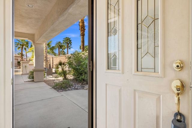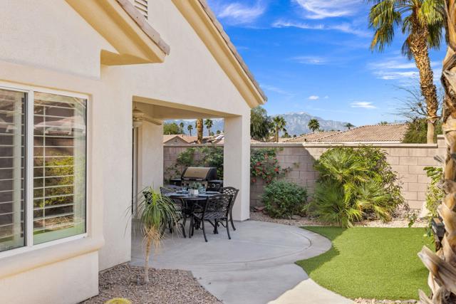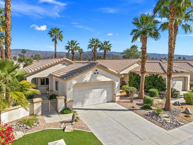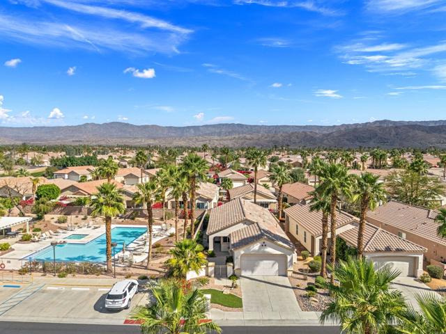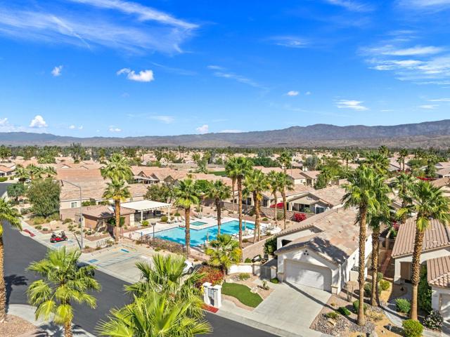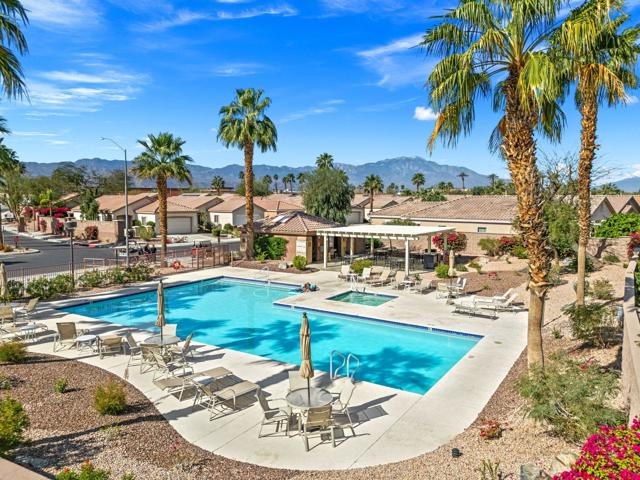 Can you imagine living just steps to a fabulous saltwater pool kept at around 87 degrees, and a spa kept at the perfect soaking temperature? Well, here it is. All the pleasure of your very own pool/spa, and no headaches. This home is perfect as a full-time, or lock-and-go property. The location is super convenient, being close to the Varner gate. It has 2 bedrooms, 2 baths, and a 2-car garage. The HVAC is newer and the home is immaculate. The kitchen includes all appliances, and a kitchenette nook for dining. The master has a bay window viewing the large, manicured backyard. The bathroom has a luxurious walk-in soaking tub, a walk-in closet, and a double-sink vanity. The guest bedroom/office has a convenient Murphy bed and is adjacent to the 2nd full bath. The living room is large and has a slider out to the inviting southwest facing backyard with a peek-a-boo mountain view. It has easily maintained turf, desert landscaping, and a covered patio for shade and comfort. The BBQ stays with the home. And now the best part...It is just a few steps to a semi-private pool and spa area. This amenity has BBQ's, bathrooms, and showers for a small monthly HOA fee. It's great for entertaining your family and friends. Bring your floatie, a book, and your favorite beverage, and relax in the warm therapeutic water. SUN CITY PALM DESERT IS A 55+ DEL WEBB COMMUNITY, ALL ABOUT A GREAT LIFESTYLE!! It has many clubs, activities, amenities, wonderful people, and low HOA dues. Play at 2 championship 18-hole golf courses and practice facilities, pickle ball, tennis, softball, bocci ball, an 18-hole miniature golf course, an honor library, arts and crafts, a ballroom for special entertainment, and 4 saltwater pools kept at 87 degrees with hot tubs. Enjoy 2 great restaurants, a martini/coffee bar, and even a post office. There is a newly renovated, classy indoor/outdoor bar with fire tables to enjoy the awesome views and our beautiful desert weather.